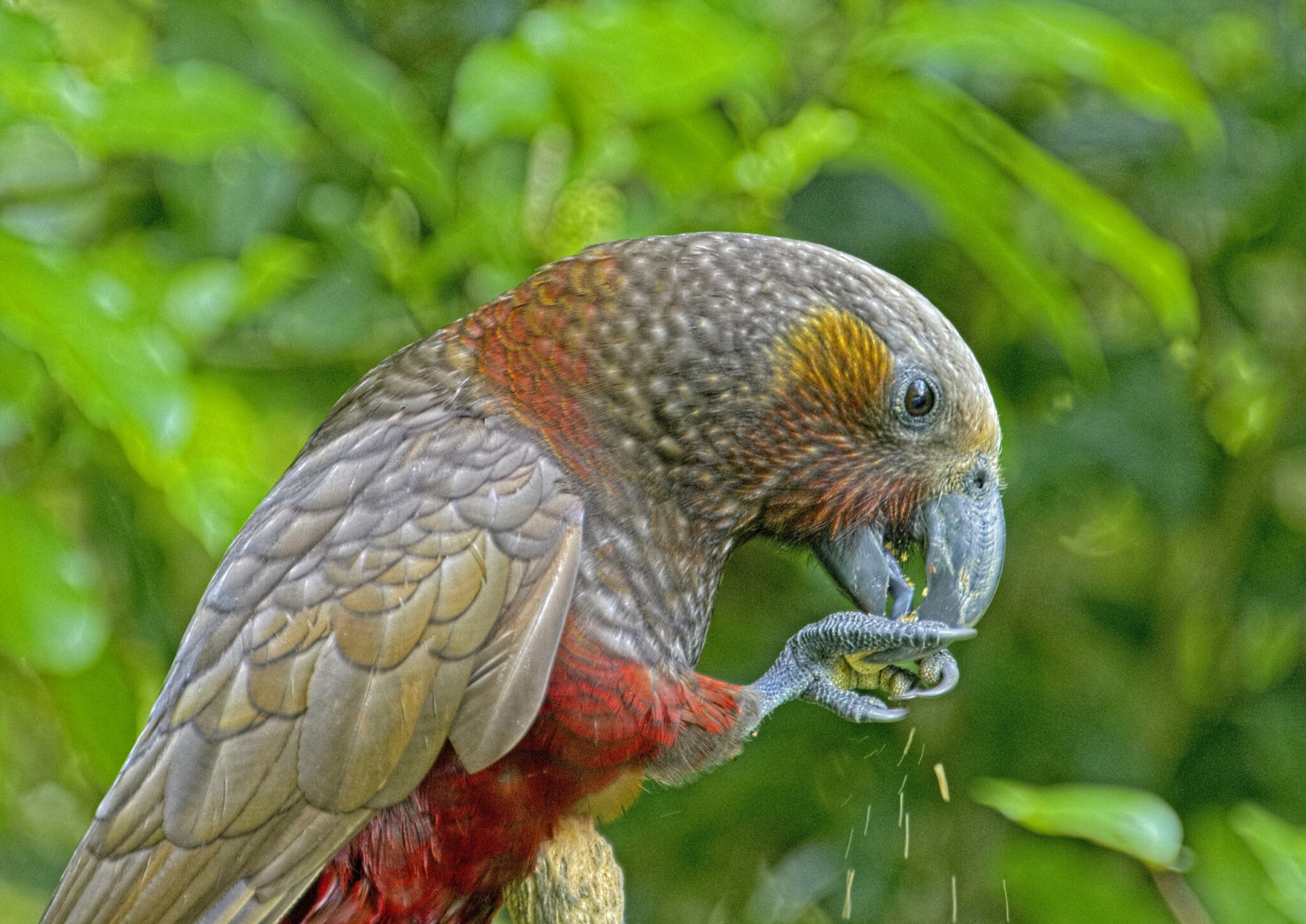 New Zealand Parrot eating seeds in a sanctuary. No snow here it is summer time and we dont have any red birds in NZ