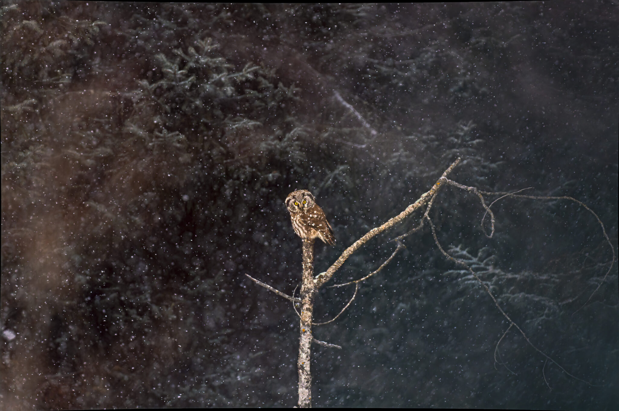 A Boreal Owl in a snow squall takes time out from scanning the ground for prey to size me up