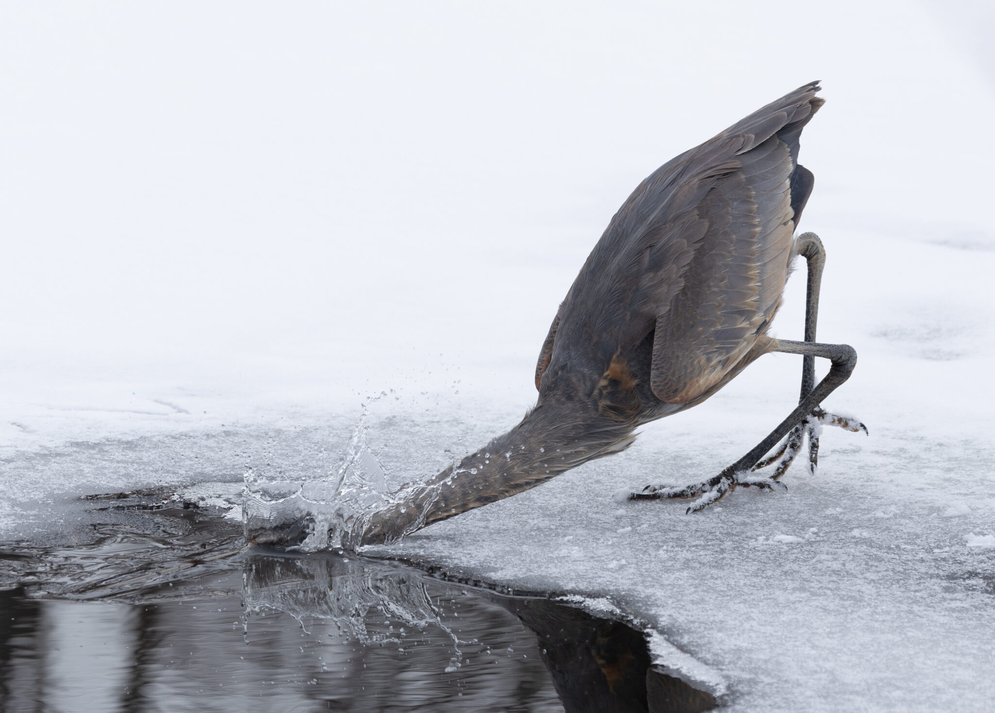 In February 2025 a Great Blue Heron spent many hours and many days staring into a small opening in the ice at Stu Visser. One day as we headed down the trail toward the opening we saw the Great Blue Heron make a strike into the water and came up empty. When we got closer, we stopped to watch it. Soon it made a couple of stealthy moves, so I zoomed in on it with my camera. I was rewarded. I was able to photograph a great sequence of its fishing abilities from this one to a photo with a fish securely in its mouth and the bird upright on the ice.