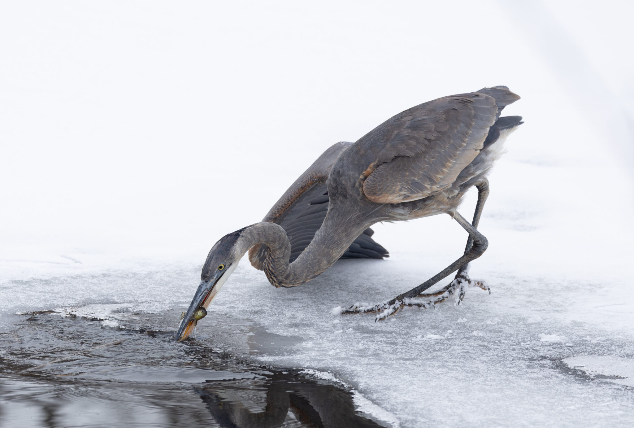 In February 2025 a Great Blue Heron spent many hours and many days staring into a small opening in the ice at Stu Visser. One day as we headed down the trail toward the opening we saw the Great Blue Heron make a strike into the water and came up empty. When we got closer, we stopped to watch it. Soon it made a couple of stealthy moves, so I zoomed in on it with my camera. I was rewarded. I was able to photograph a great sequence of its fishing abilities.