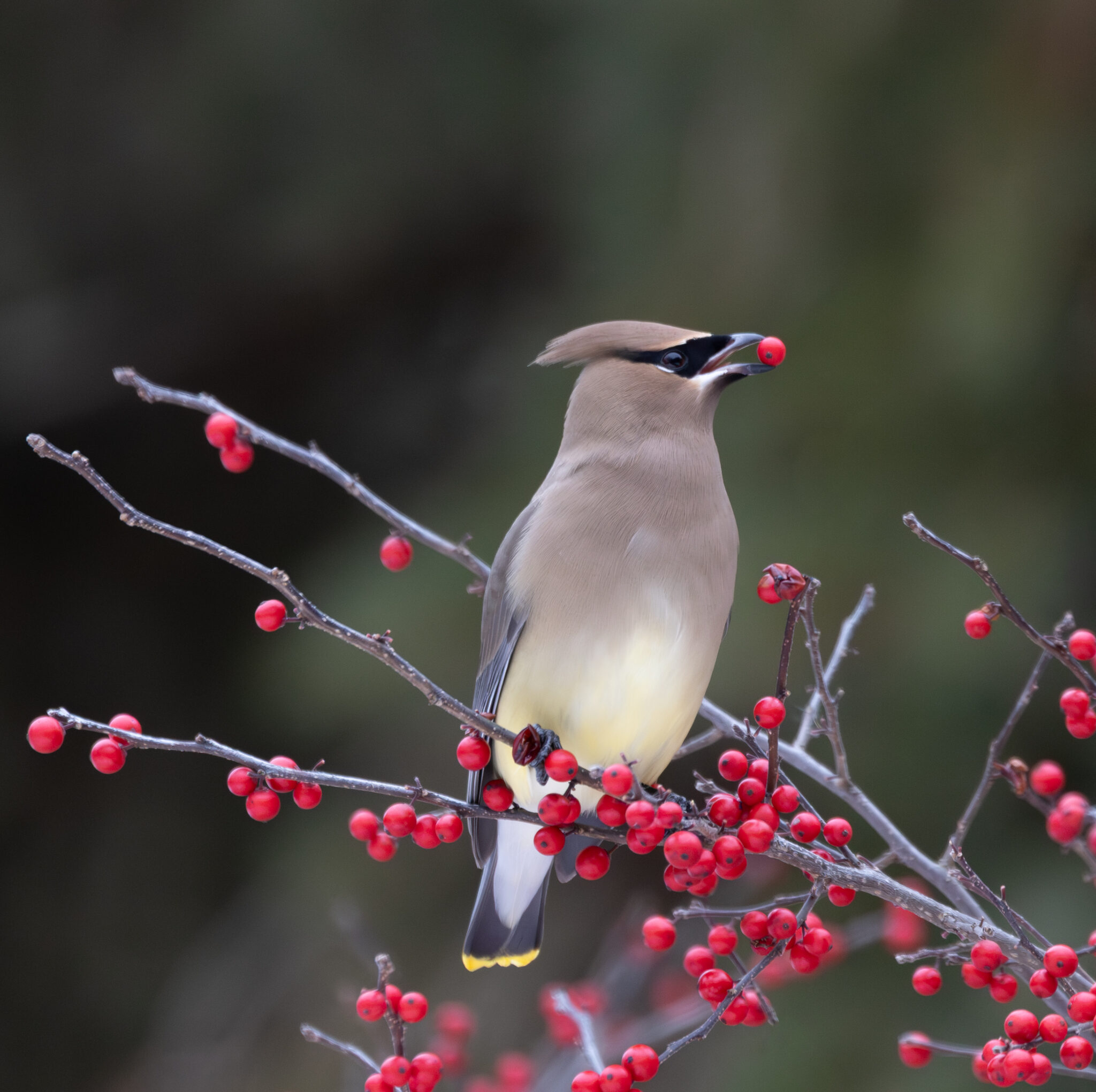 Every winter after a hard freeze about Christmastime we keep scanning our Michigan Holly hoping that the roving Cedar Waxwings find them. Here is a happy Cedar Waxwing just before he downs the berry. Looking closely at the photo, you can see the brownish iris.