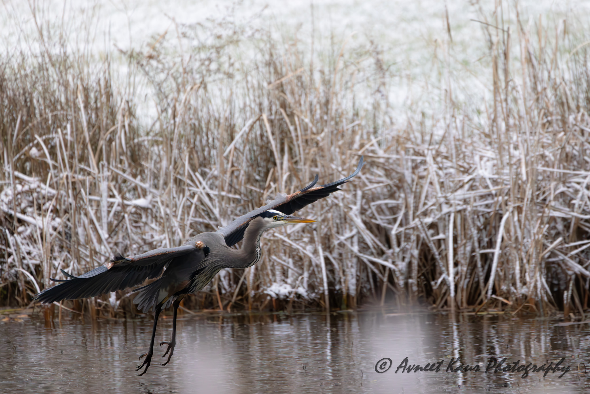 A great blue heron gracefully glides over a marsh area dusted with snow. The reflections in the water add a serene quality to the winter scene!!! Lexington – Kentucky; December 2024