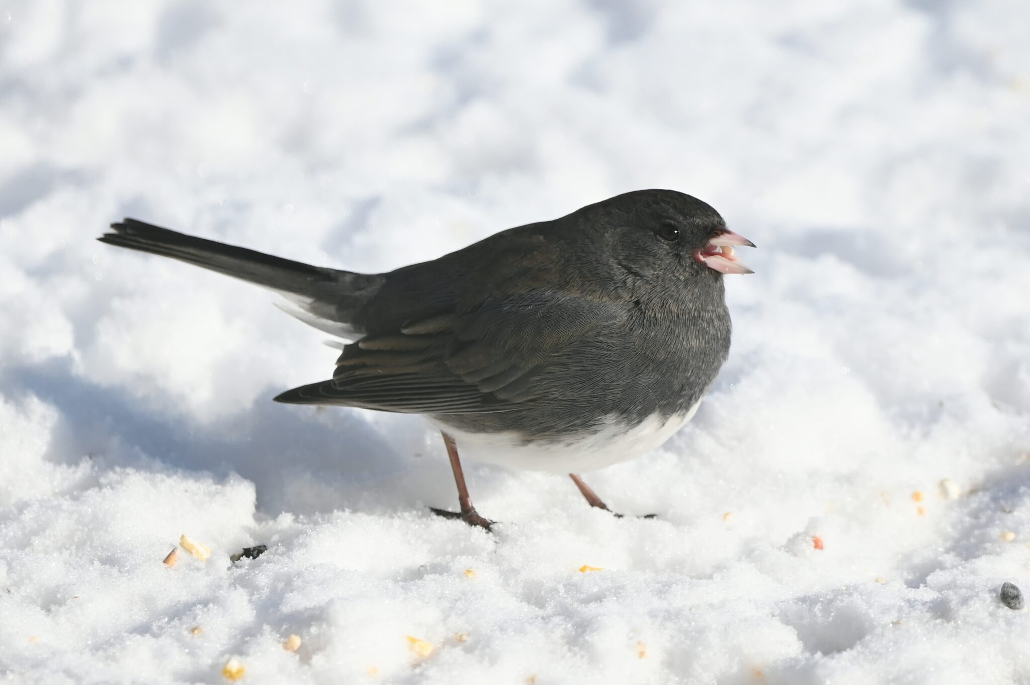 It’s pretty common to see dark-eyed juncos foraging for food on the ground, with or without snow.