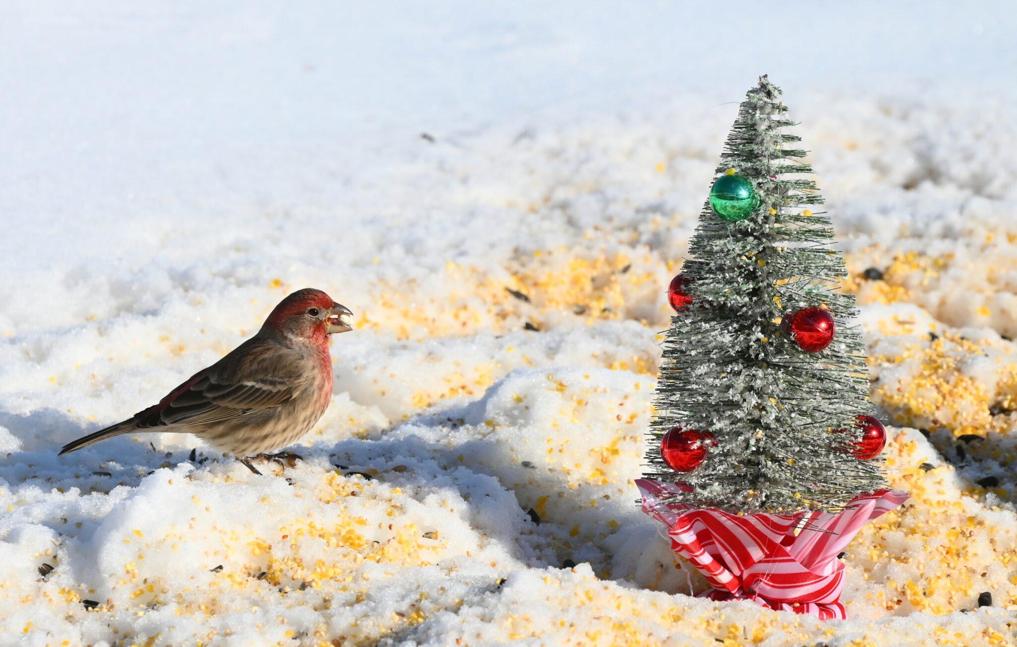 A male house finch takes a look at his Christmas tree between bites of bird seed. For a more detailed description see my “Rockin’ Around the Christmas Tree” photo.