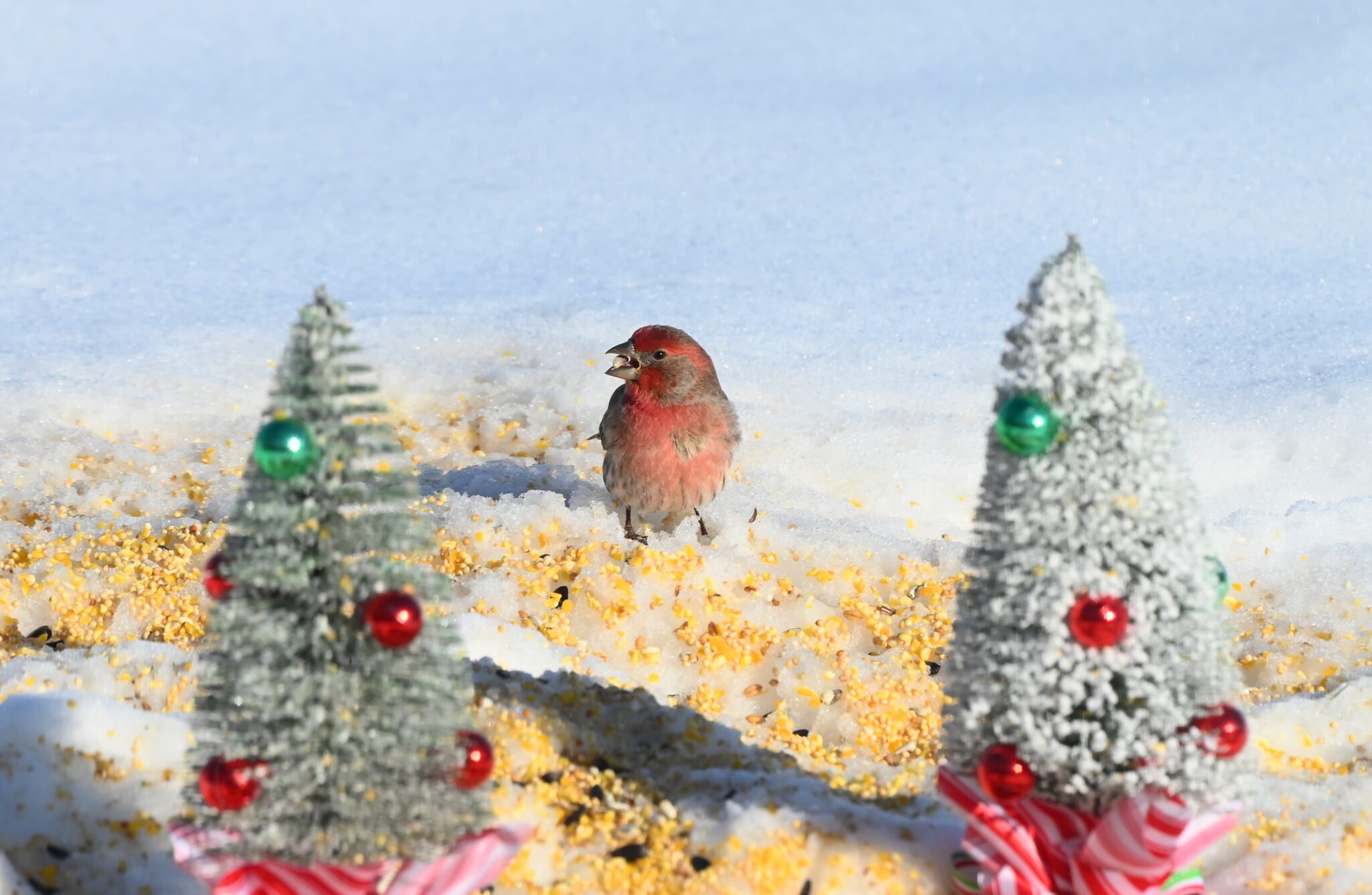 The male house finch between my two miniature Christmas trees could pass for a Christmas caroler if his mouth wasn’t full. For a more detailed description, see my “Rockin’ Around the Christmas Tree” photo.