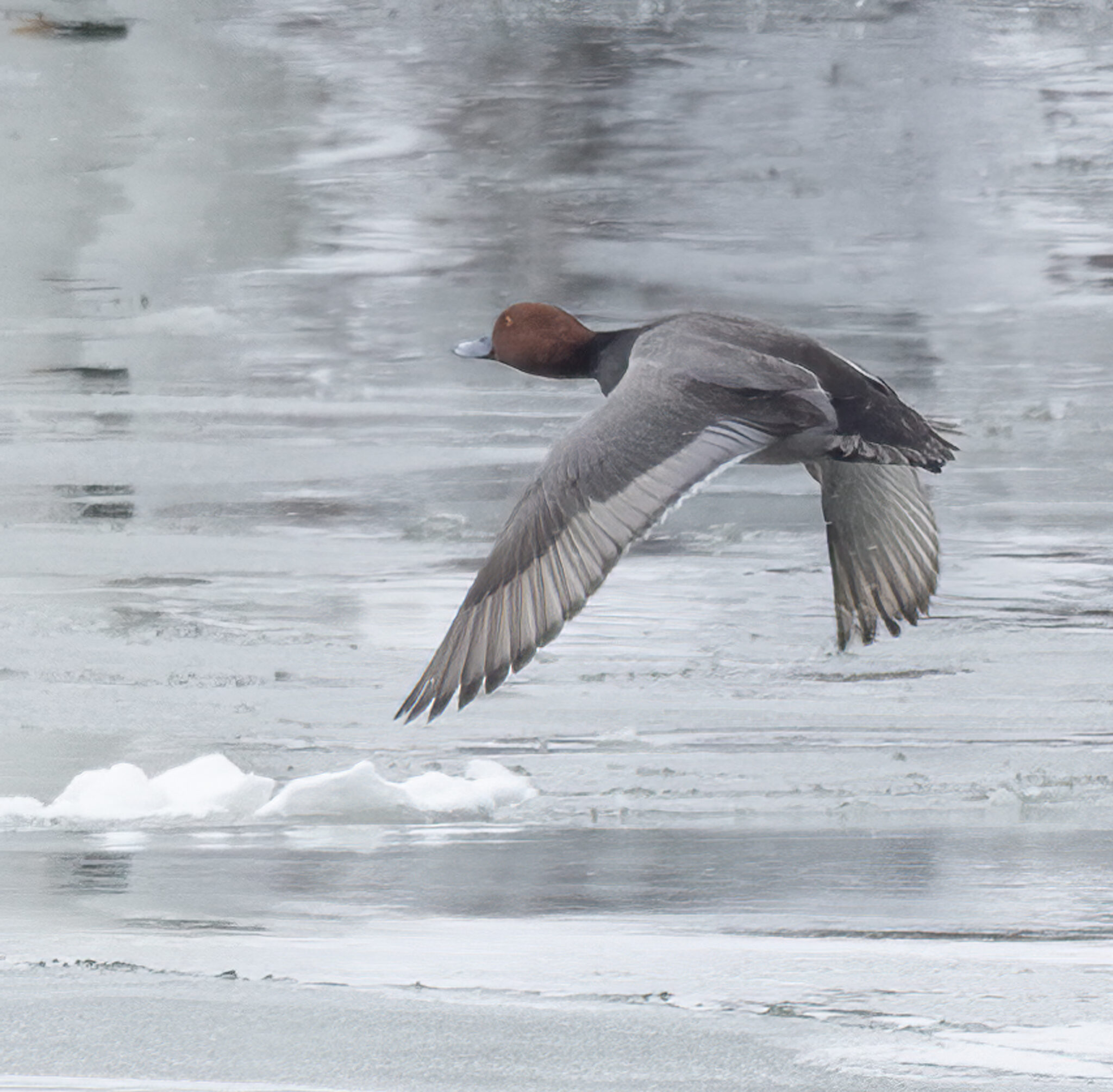 During a cold winter the channel at Holland State Park mostly freeze. Sometimes there are two open pockets of water, one at each end of the channel. This Redhead was flying down the channel.
