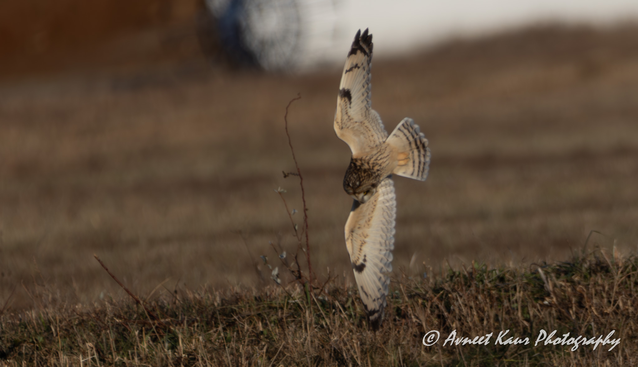 A short-eared owl is captured mid-dive over a grassy field. The background is slightly blurred, emphasizing the bird’s motion!!! Charlestown – Indiana; December 2025