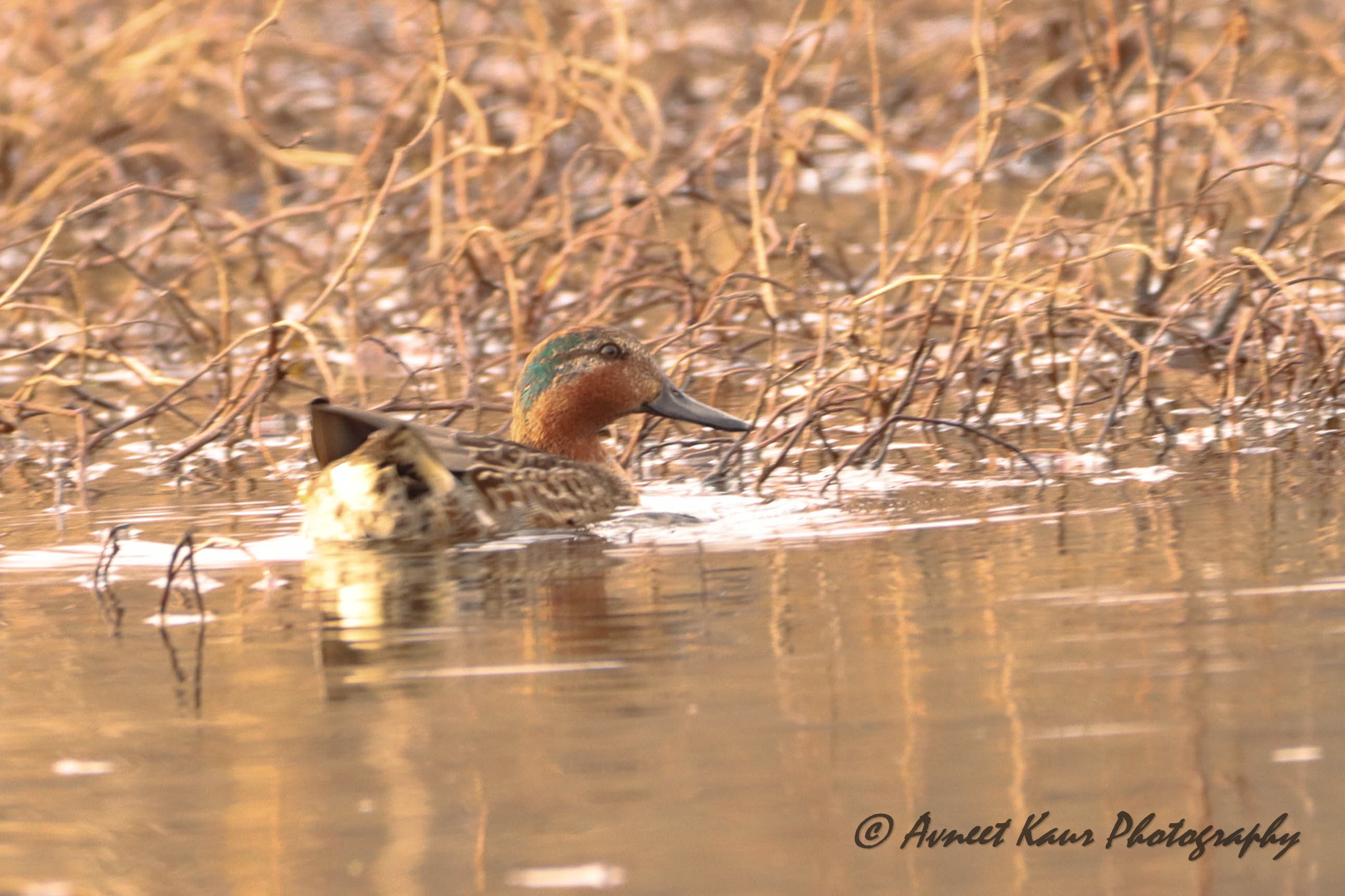 A lone green-winged teal waterfowl floats serenely on a reflective surface, surrounded by dry, entangled reeds. The scene is calm and earthy, showcasing nature’s tranquility!!! Rockcastle County – Kentucky; December 6, 2020