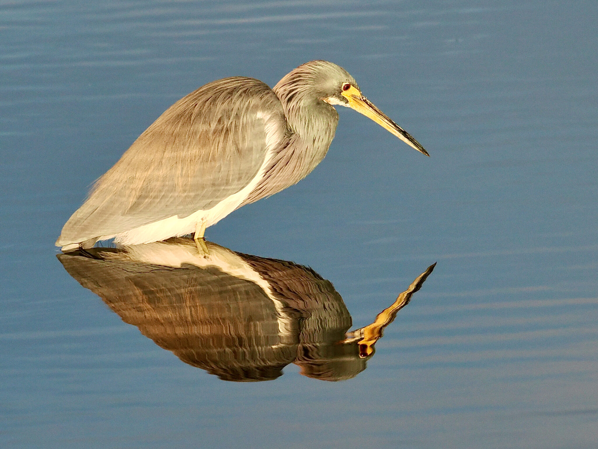 I spotted the resting Tricolored Heron while we were enjoying the spectacle of thousands of birds in the water and trees at the Black Point Wildlife Drive at the Merritt Island Wildlife Refuge late in the afternoon. The water was calm and reflective. I loved how the ripples on the water were reflected on the bird.