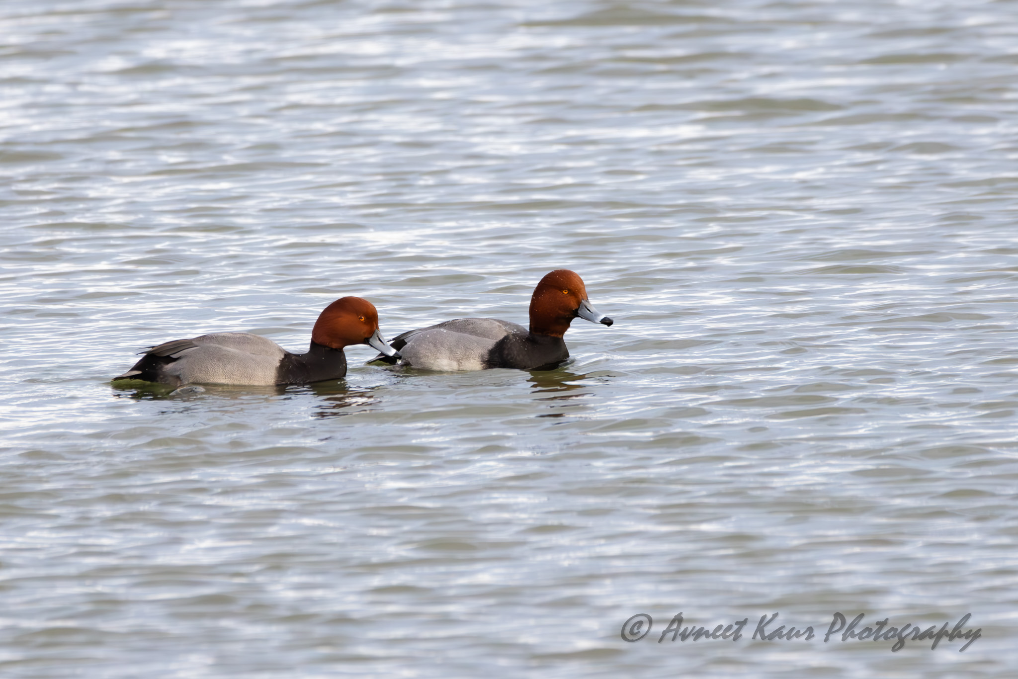 Two redhead ducks glide gently across a serene lake. Their distinctive russet heads contrast against the shimmering water!!! Hamilton, Ohio; January 11, 2026