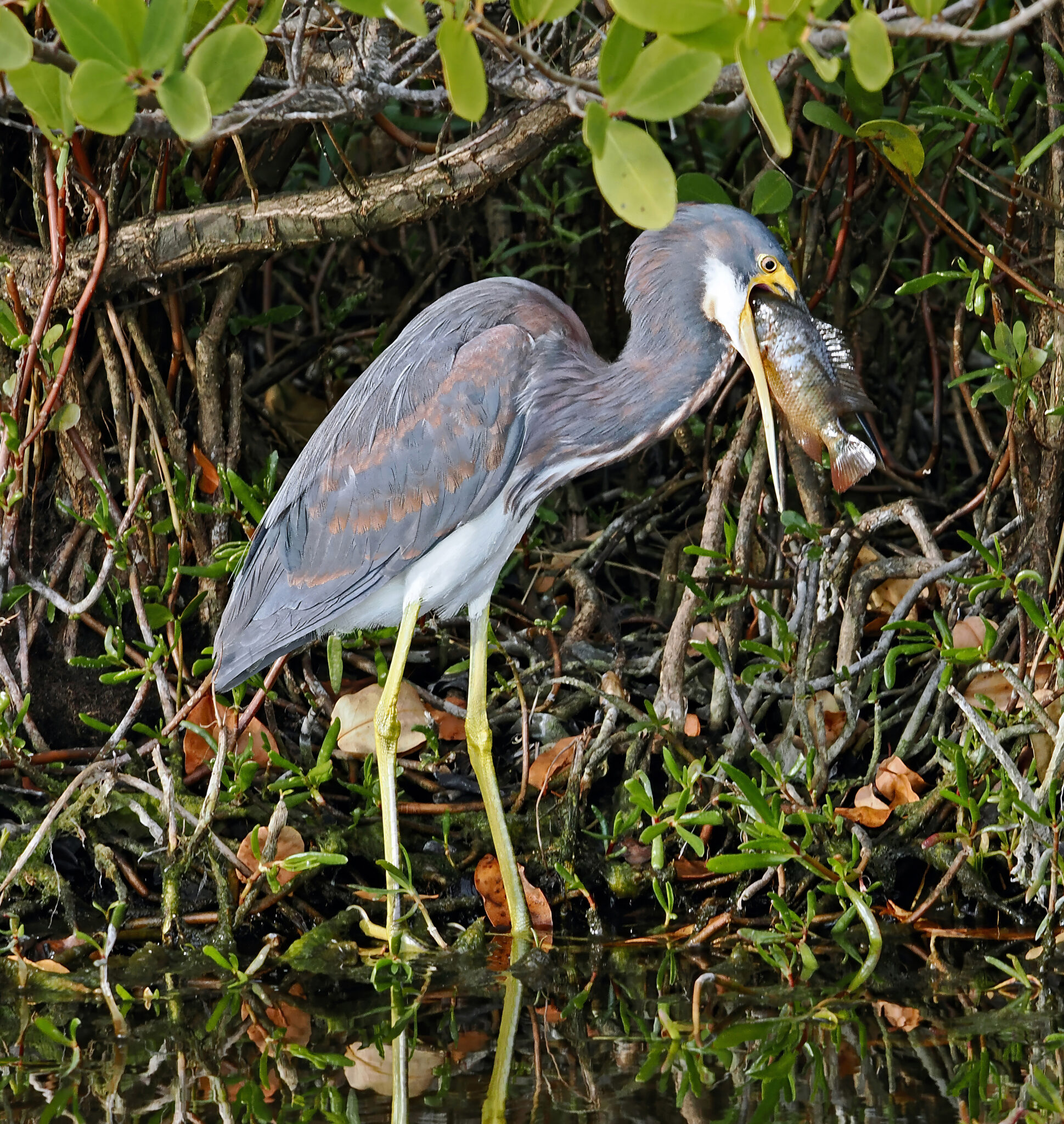 There were many Tricolored Herons hunting among the mangroves on Merritt Island. We observed this one hunting and then catching a fish. We watched the bird for more than 10 minutes as it tried to eat its catch that was seemingly too large for it to swallow!