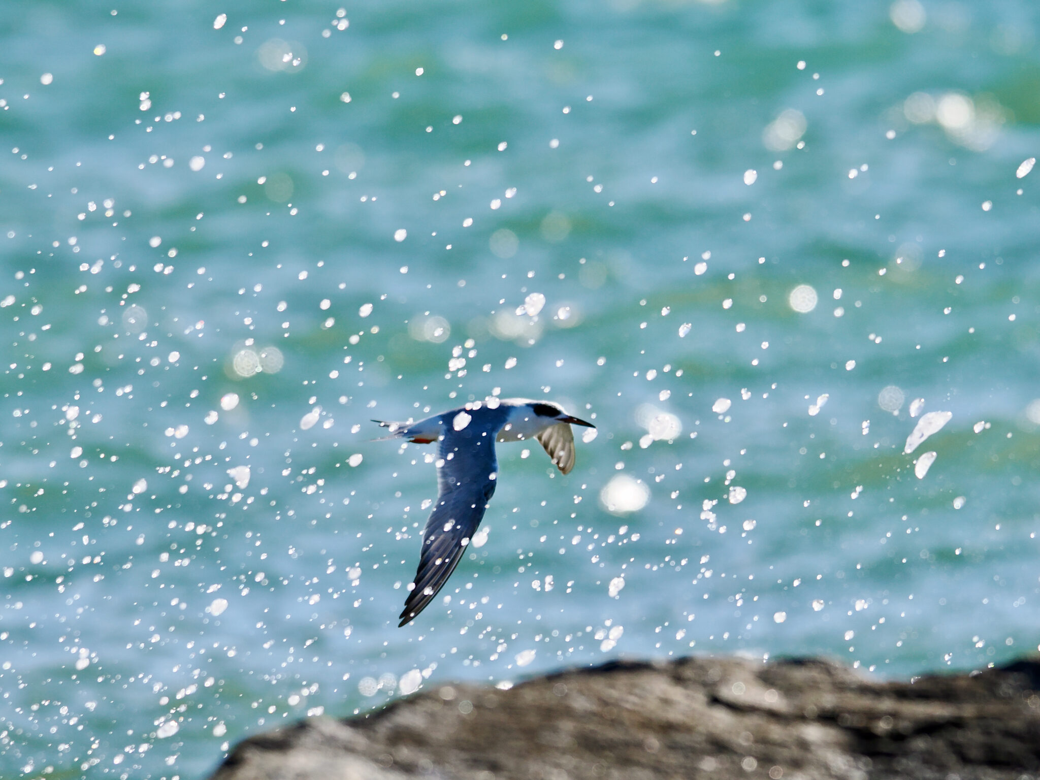 We walked out on the Jetty Park pier among the dozens of people fishing, most with 4 or 5 lines in the water. The south side of the pier is protected from the ocean waves by a stone breakwater that was a popular roost for about 50 Brown Pelicans. The ocean waves crashed on the breakwater and splashed up 10-20 feet. There were several terns flying in the area and this Forster’s Tern repeatedly cruised along the face of the breakwater. I watched as the Tern continued on its course, even though the spray when the waves crashed and splashed.