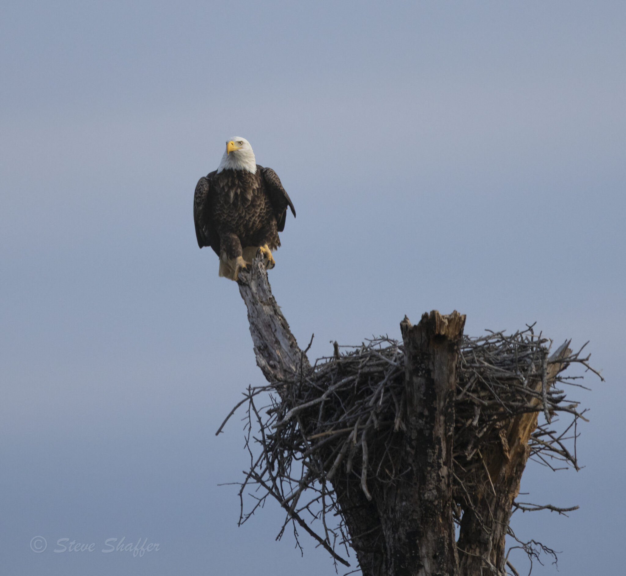 Adult bald eagle perched on old osprey nest that was pilfered earlier in the Spring/Summer by bald eagle(s). Now used as prime location for hunting waterfowl.