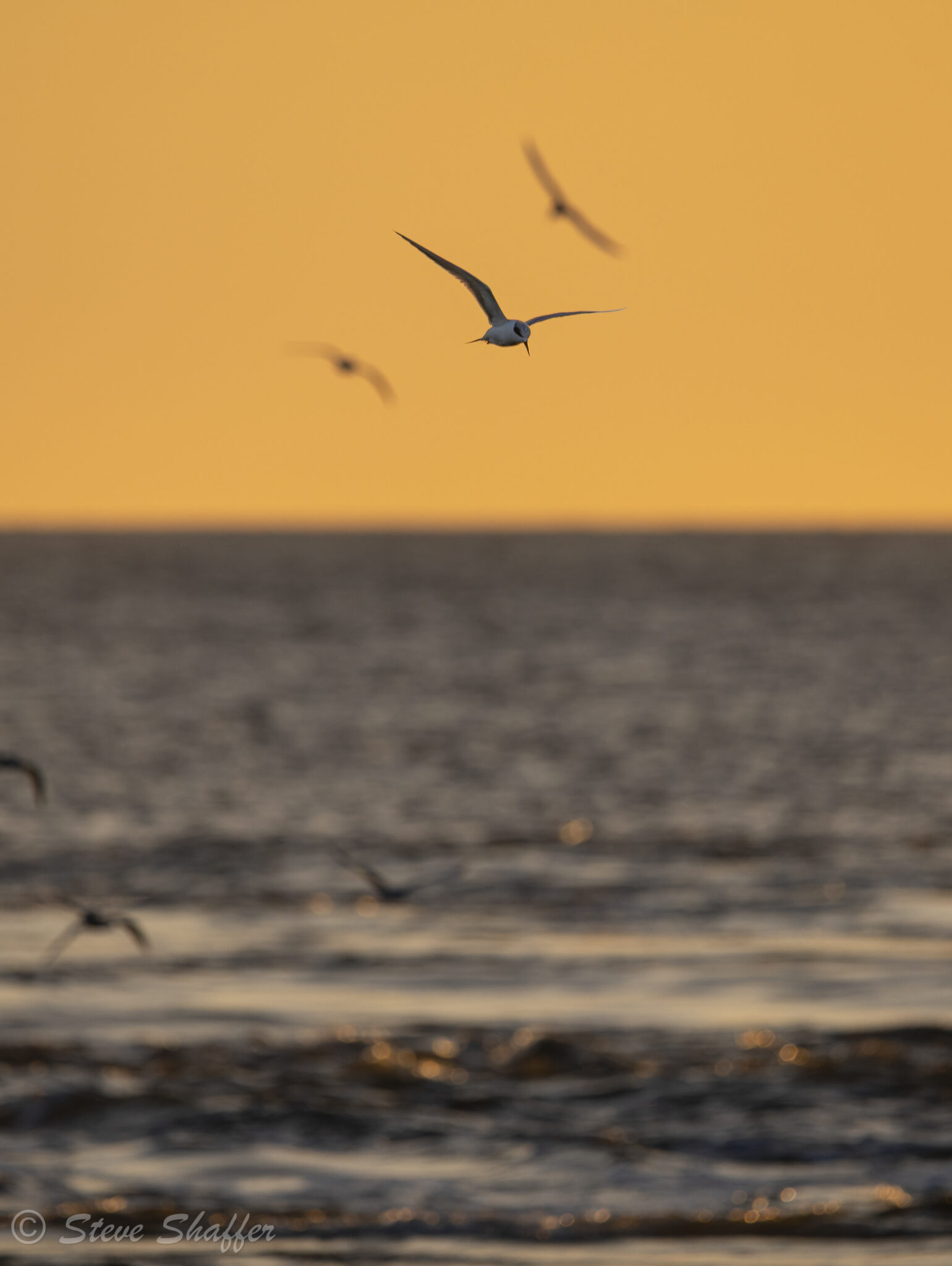 Forster’s terns’ feeding frenzy at sunrise during incoming tide at Indian River Inlet