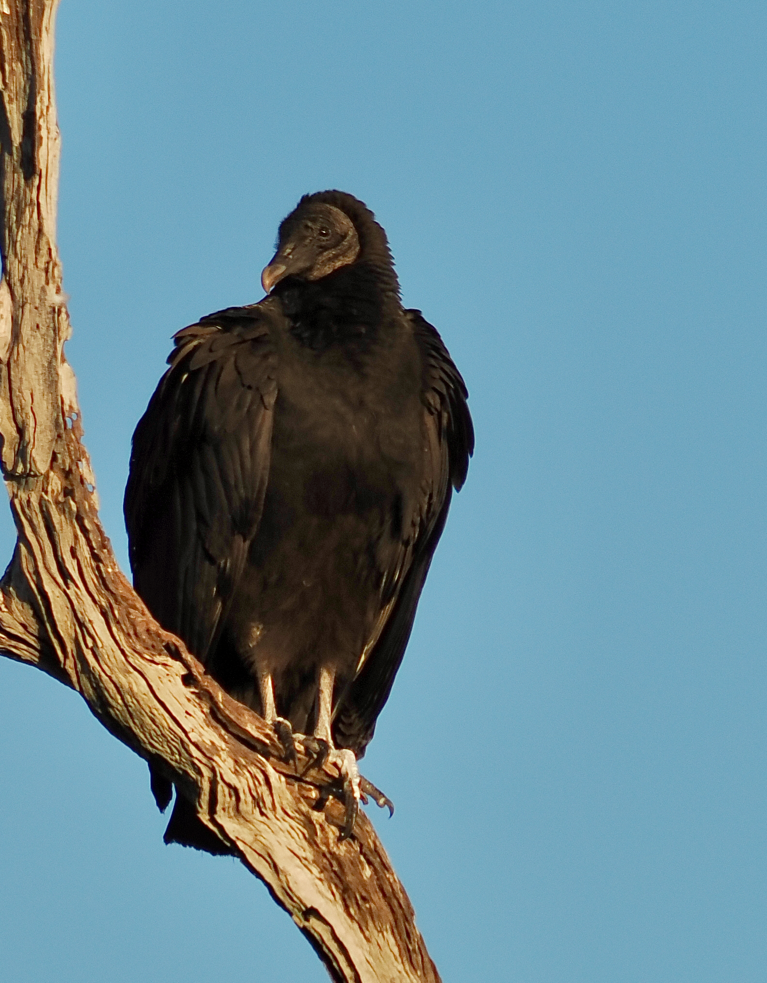 On New Years Day 2026 we visited the Orlando Wetlands and observed Roseate Spoonbills roosting together with 200-300 Black Vultures. This bird was roosting on a bare branch with another Black Vulture and 5 Roseate Spoonbills – see my prior post. The setting sun provided a soft light that allowed me to capture details on this majestic bird that are normally not visible in brighter light.