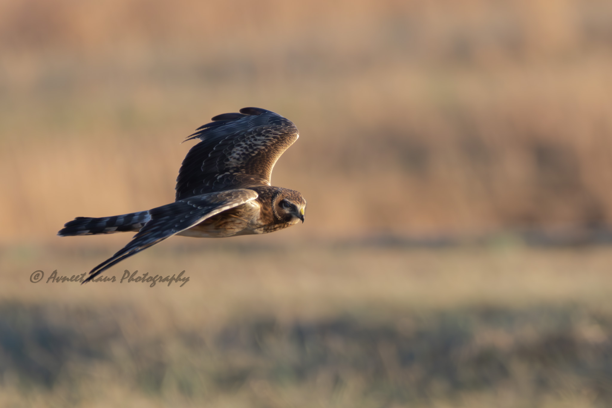 A northern harrier glides gracefully above a blurred natural background, showcasing its sharp features and extended wings. The bird’s keen gaze is fixed forward as it soars effortlessly!!! Lexington – Kentucky; January 12, 2026