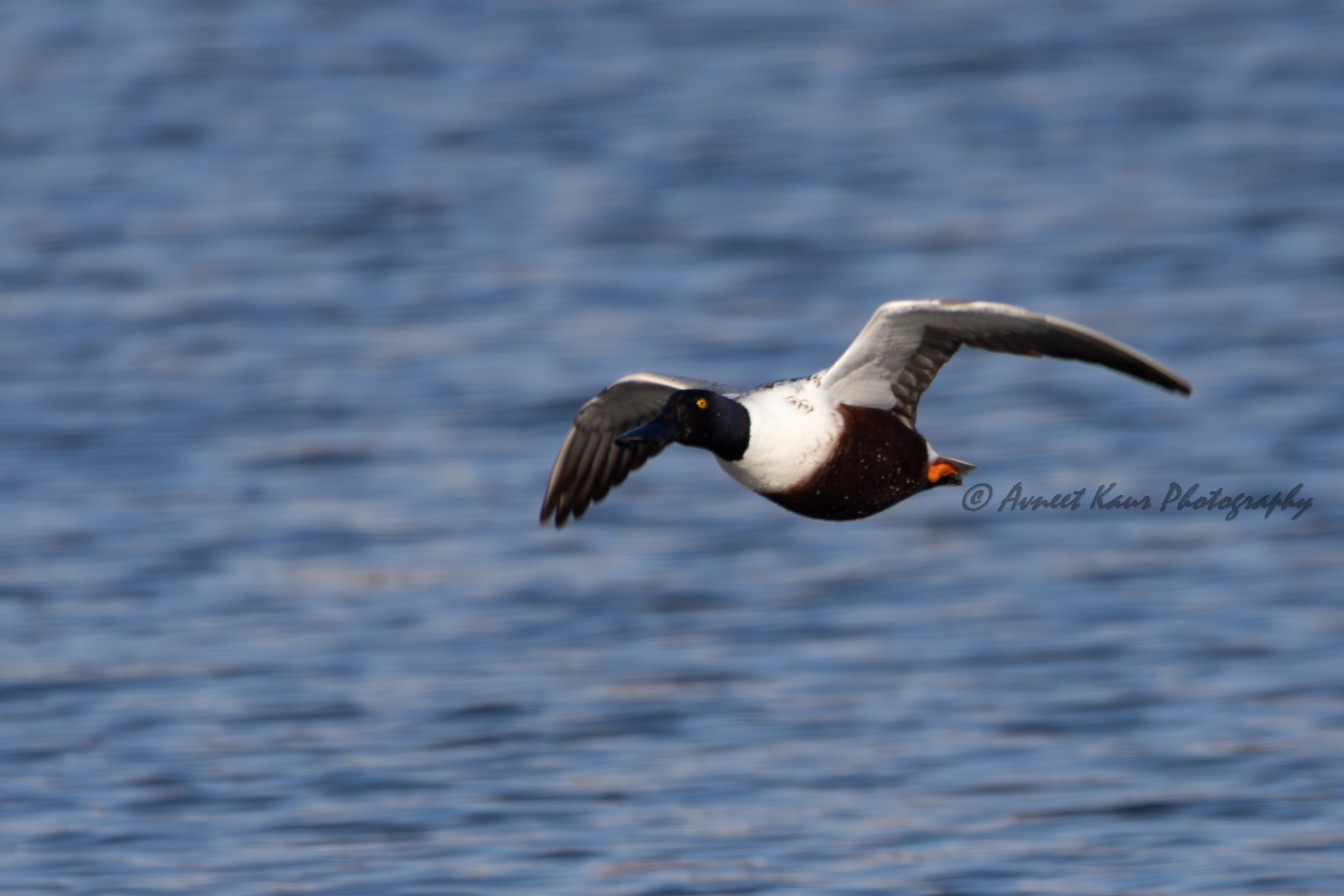 A northern shoveler – male is captured mid-flight as it glides over a body of water. The wings are spread wide, and the water below has a deep blue hue!!! Local Pond – Lexington, Kentucky; January 17, 2026