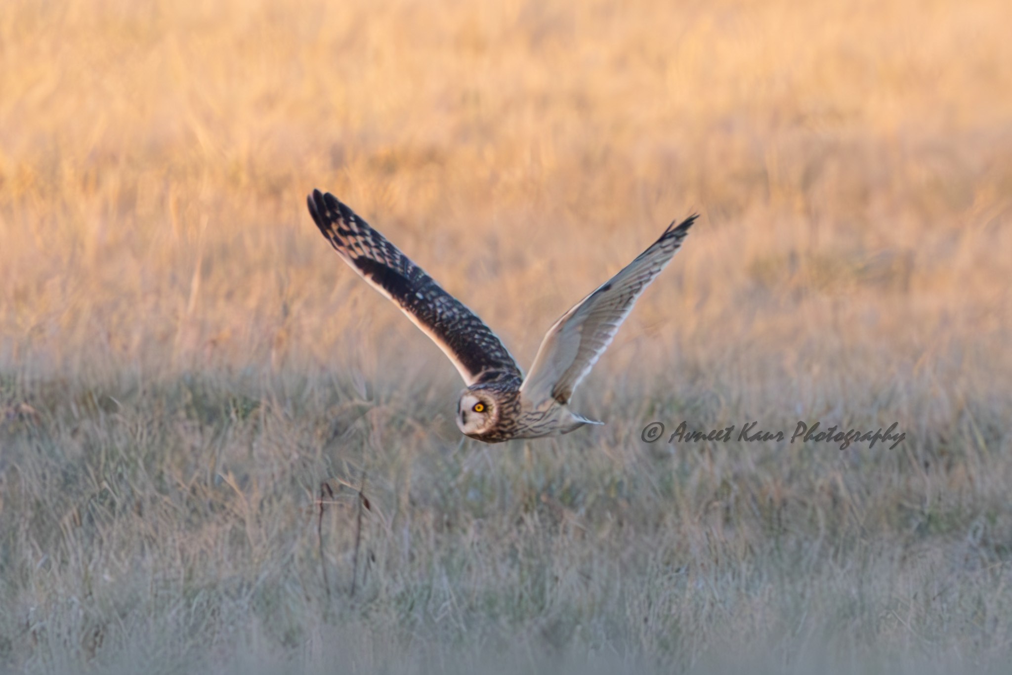 A short-eared owl glides smoothly above a field, its wings fully extended. The soft focus in the background creates a peaceful atmosphere!!! Lexington – Kentucky; January 22, 2026
