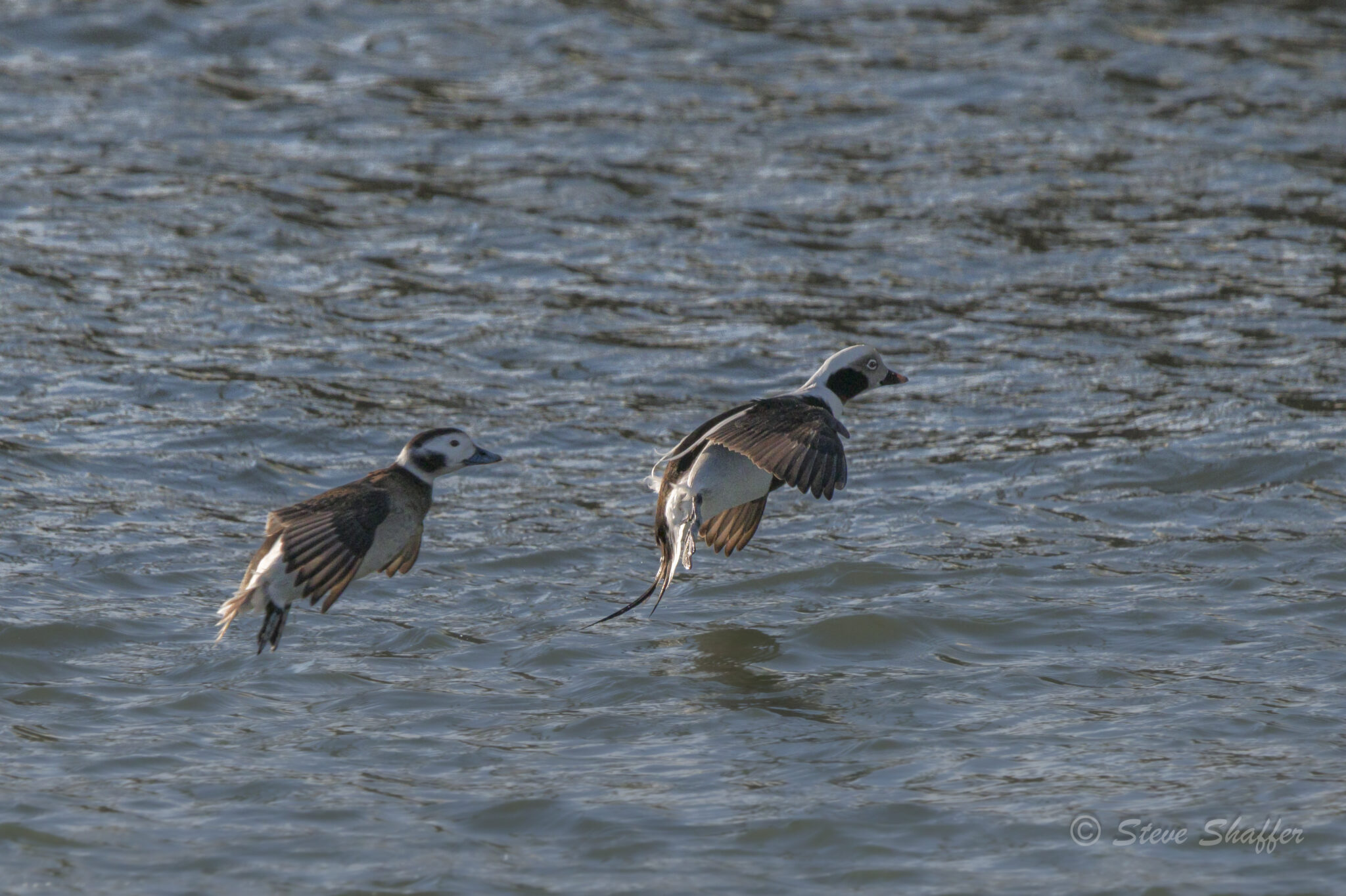 A pair of long-tailed ducks coming in for a landing in the rapid tidal current of the Indian River Inlet at Delaware Seashore State Park. The ducks dive down while feeding and eventually drift several hundred yards away within the inlet because of the powerful tidal flow and then take flight to put them back into their previous starting point.