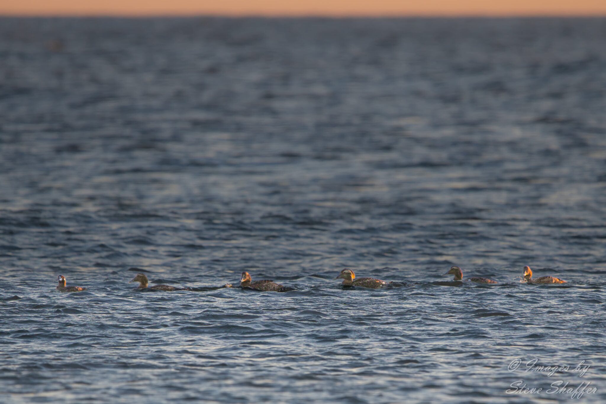 Early morning parade off the coast of Delaware led by a (rare for location) female harlequin duck followed by common eider females.