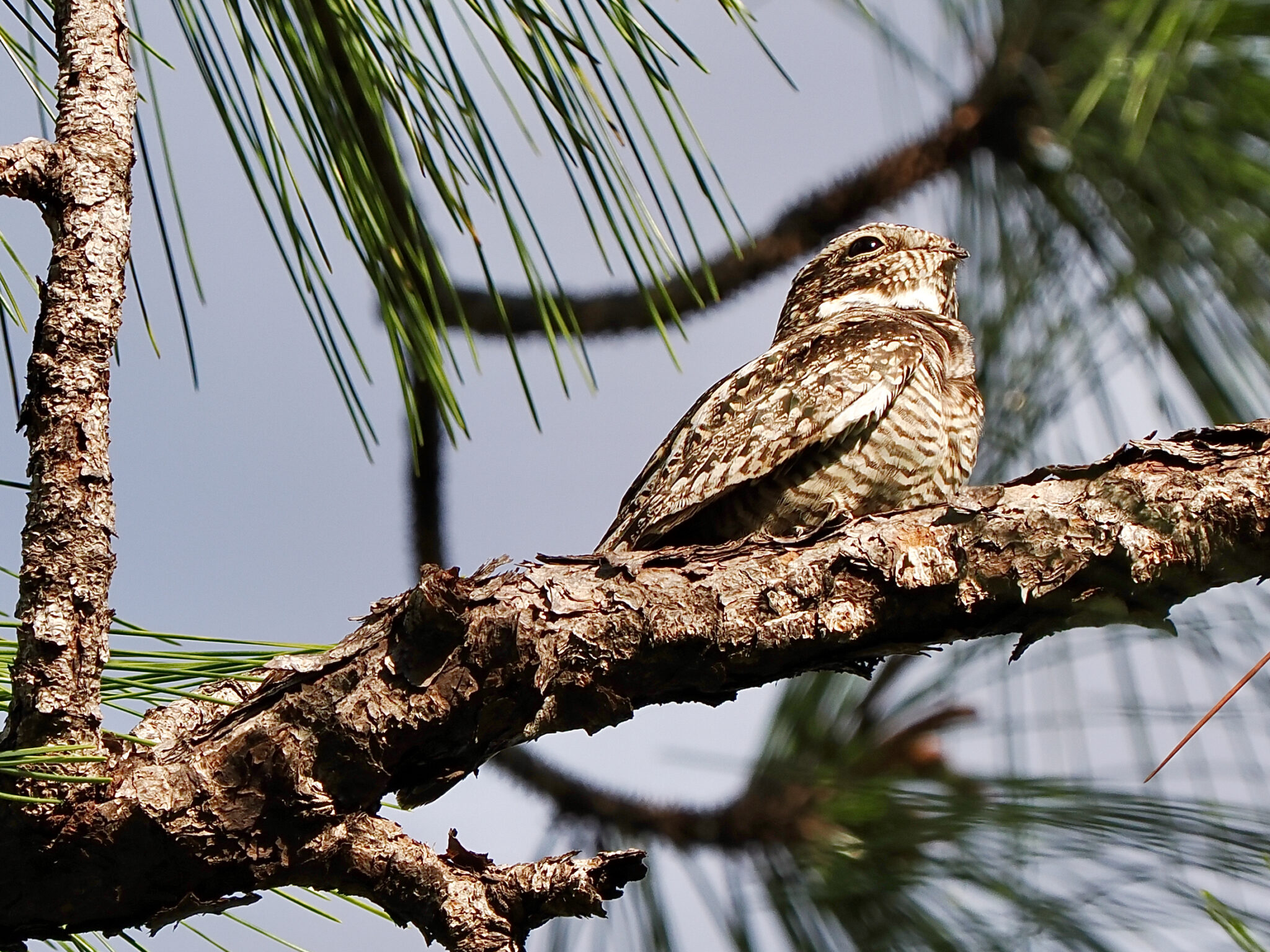 Sheila saw a rare bird alert on eBird for a Lesser Nighthawk. Lesser Nighthawks are found from central Mexico and further south, but sometimes appear in south Florida. The eBird GPS location brought us to Lakes Park. A birdwatcher in the parking lot gave us directions for a mile hike to the northwest corner of the park. I navigated us there, found the described path and perch area. My daughter spotted the bird perched about 40 feet up in a pine, in silhouette with the afternoon sun behind the bird. We carefully stepped through the tangles in the woods until we had the sun behind us, and the bird in better light. Group effort – mission accomplished!