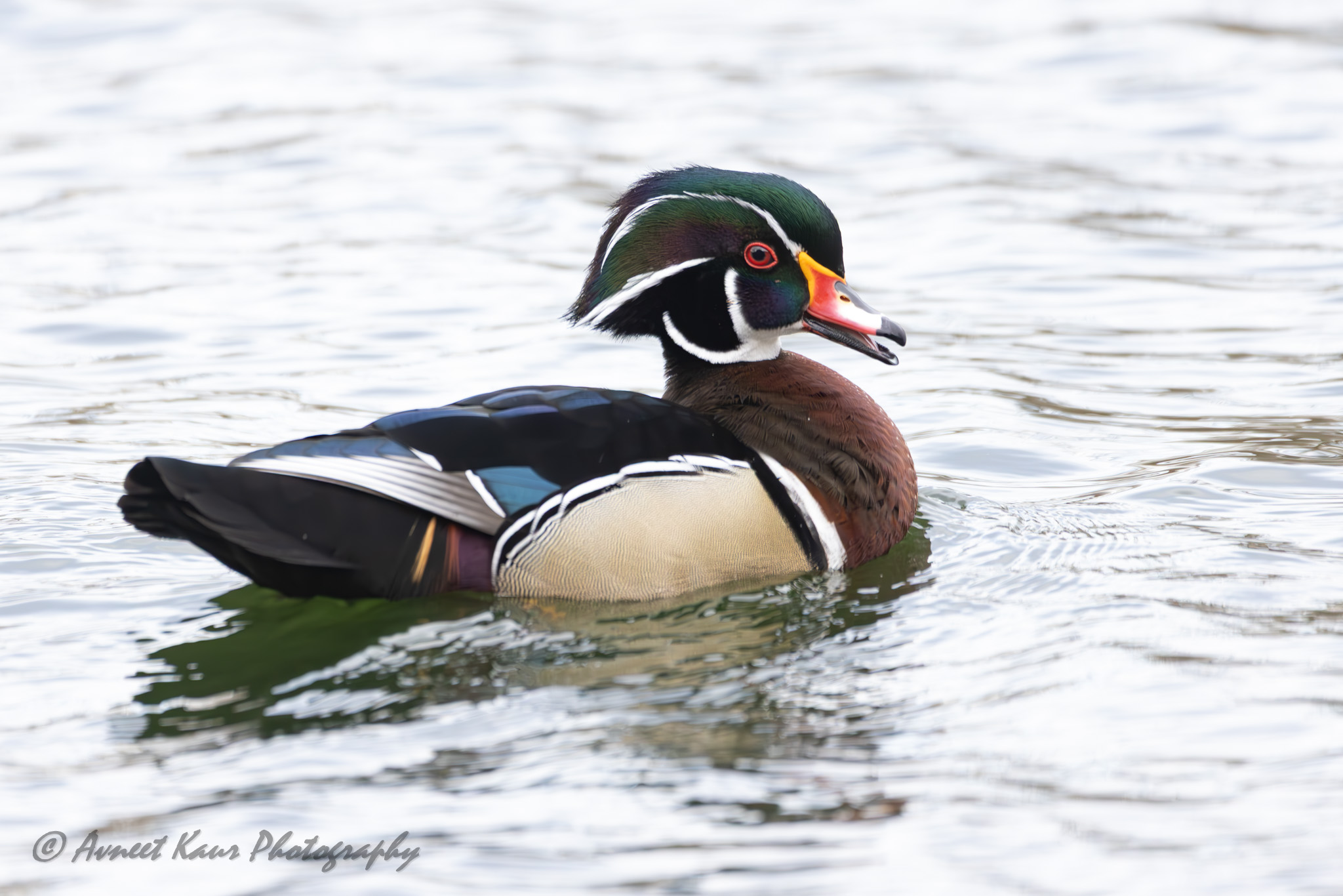 A striking wood duck – male glides gracefully across the water. Its vibrant plumage reflects beautifully in the ripples!!! Lexington – Kentucky; January 13, 2026