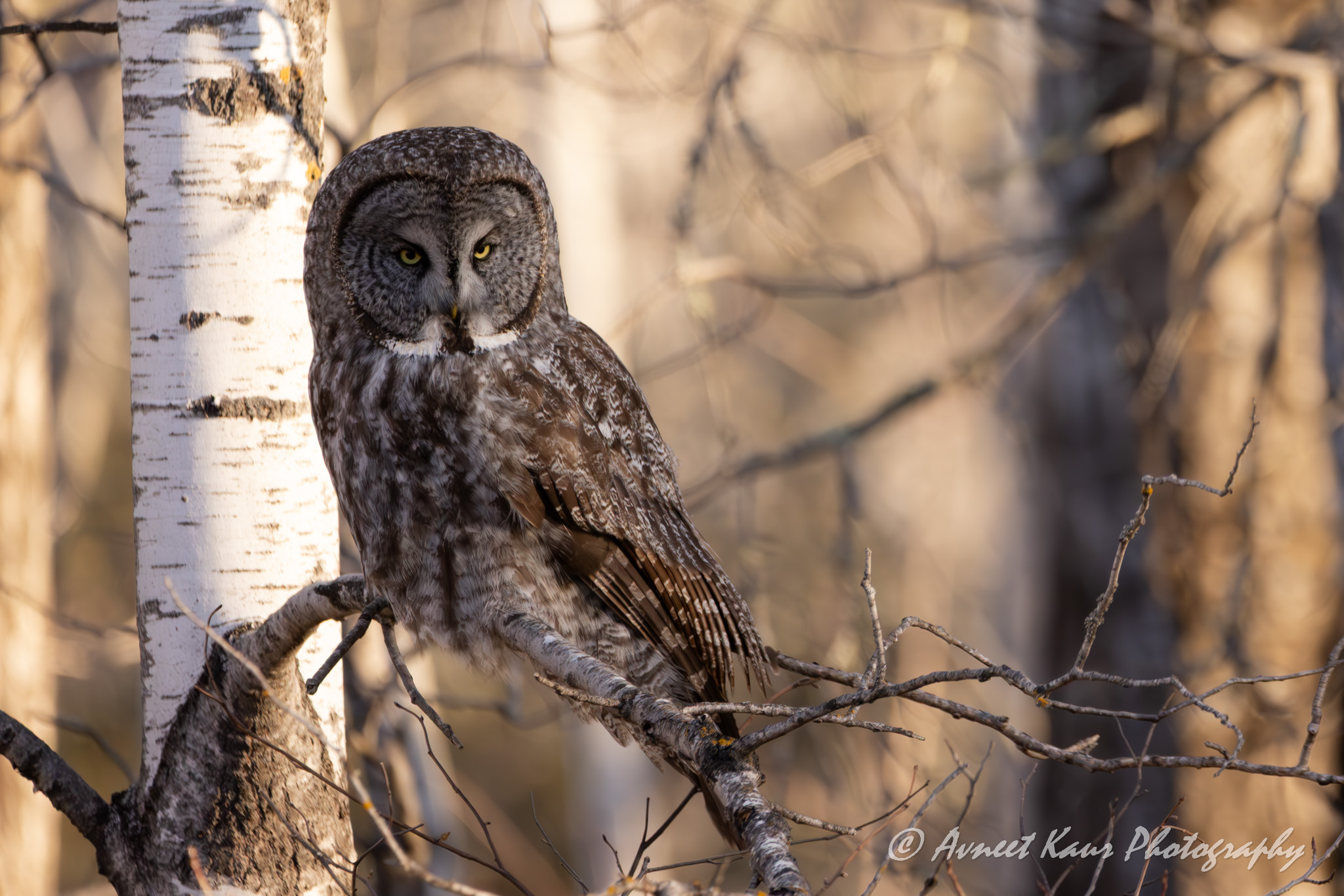 A majestic great gray owl perches on a birch tree branch. Its striking yellow eyes and intricate feather patterns are beautifully captured in the woodland setting!!! Sax-Zim Bog – Minnesota; January 2025