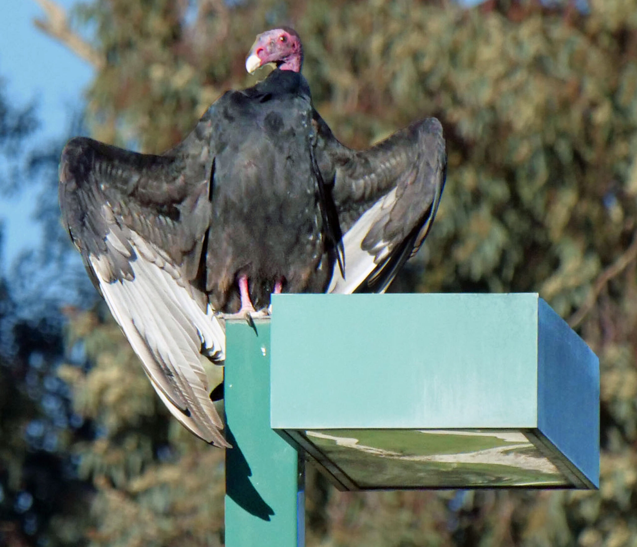 The turkey buzzards frequently rest atop the tall street lights in the morning to warm up after a cold night. This one took a spot on a much lower light to rest. Our temps were in the upper 40s this morning so the buzzards needed to dry their feathers and warm up.