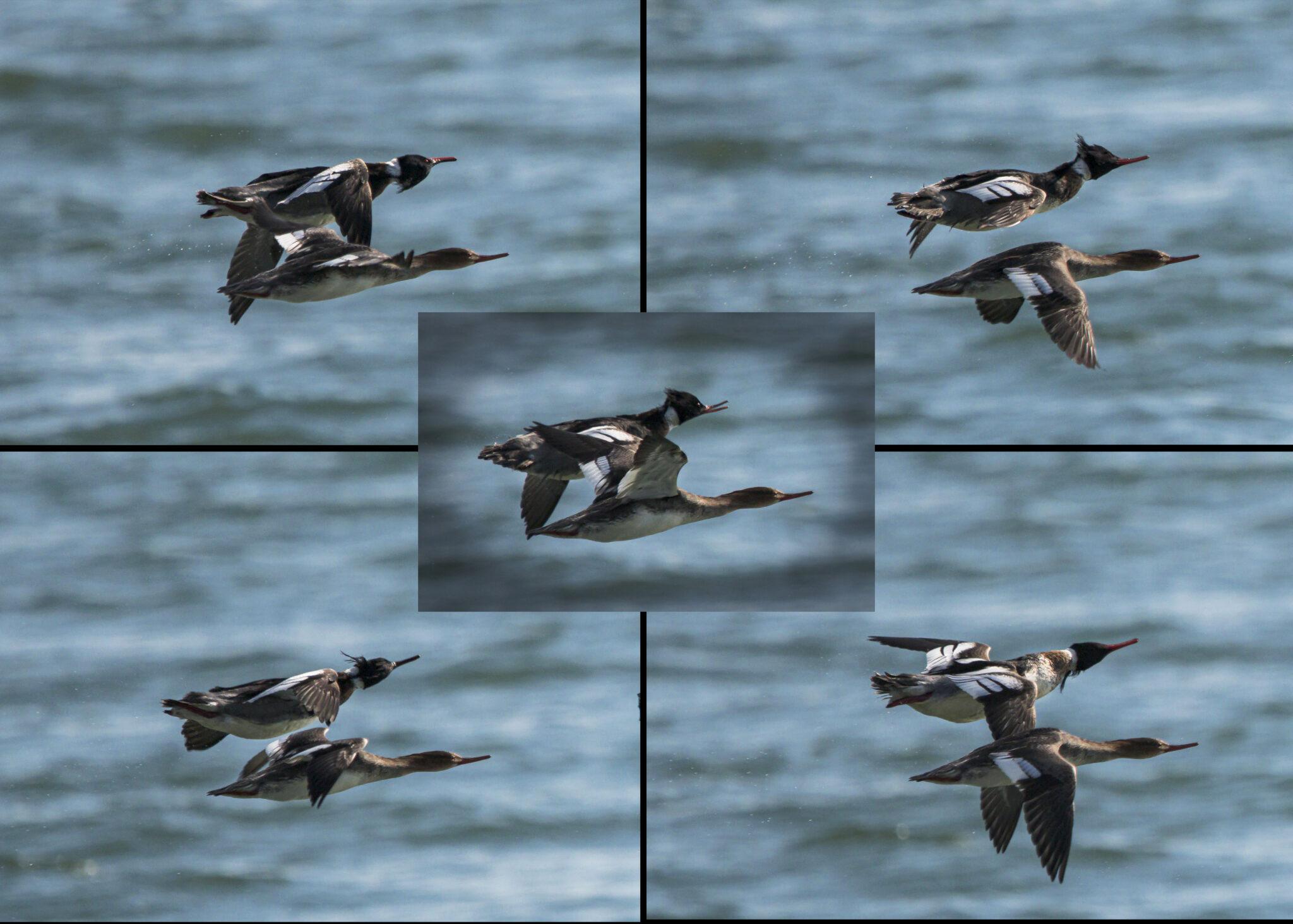 Was birding off of the coast in the Delaware Seashore State Park today and seeing mainly 3 scoter species (black, surf and white-winged), lesser scaups, long-tails and red-breasted mergansers feeding just off shore. A group of 5 red-breasted mergansers took flight and I tracked them for a few hundred yards photographing the group in flight and just happened to capture the two trailing male and female with the male shaking off water from its shaggy crest in flight. The five consecutive images captured in sequence at 40 fps begin in the upper left and proceed clockwise ending in the center image.