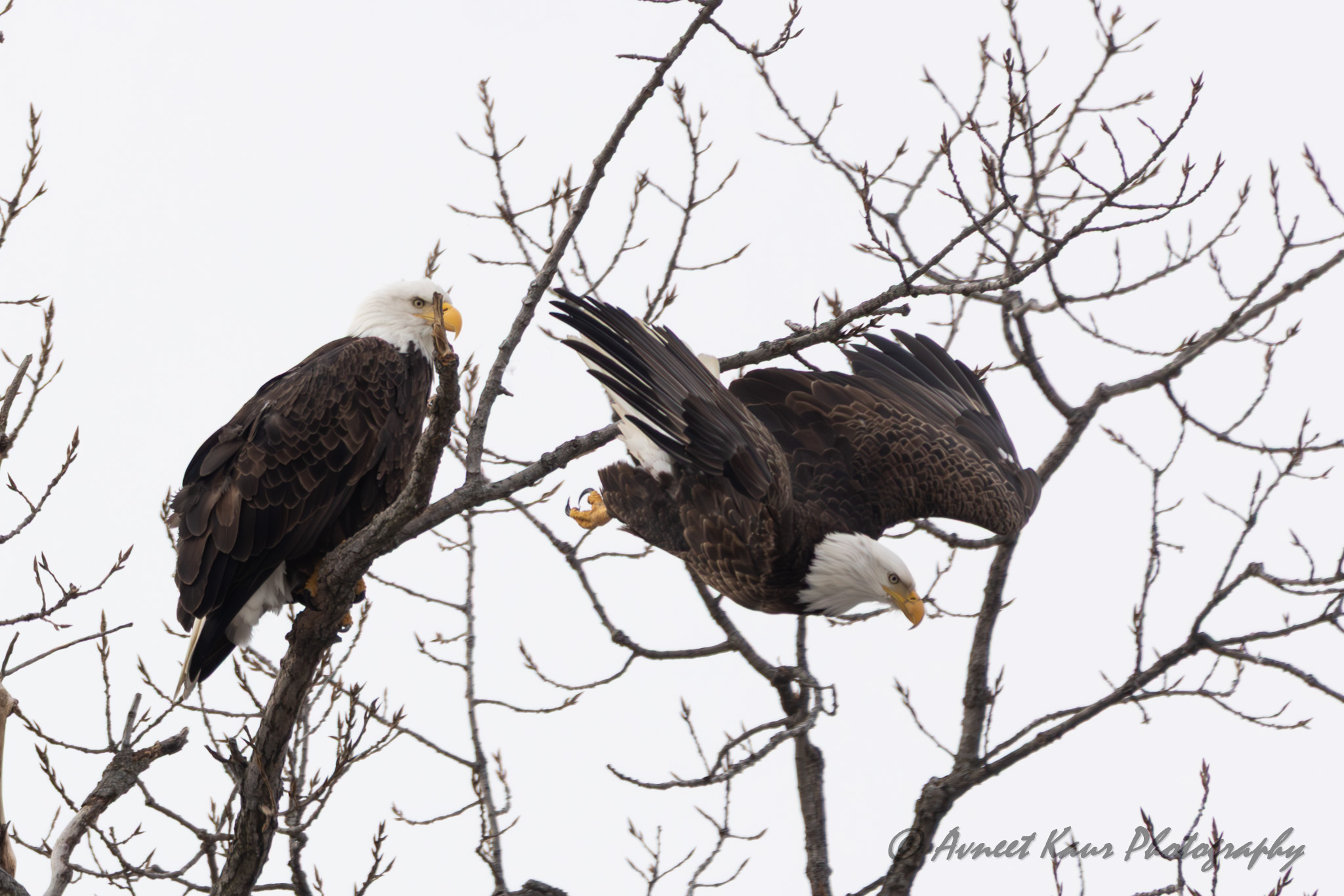 Two bald eagles perch on bare branches. One of the eagles is taking flight, wings spread wide!!! Monroe – Ohio; February 12, 2026