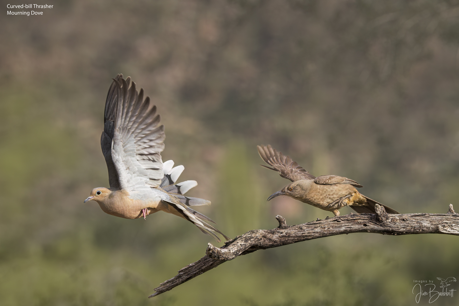 Watching birds interact is one of my joys during my photography outings. These two, a Curve-billed Thrasher and a Mourning Dove, are common desert birds. Even though the dove is larger, the Thrasher is far more aggressive and will not allow one of the doves to even perch near the food source. This Thrasher actually “stalked” the dove down this branch and finally rushed forward to drive it away. After the dove left, the Thrasher sat for a few seconds and then left itself. Just the satisfaction of bullying the dove I guess. Little processing done in PS. About 75% FF.