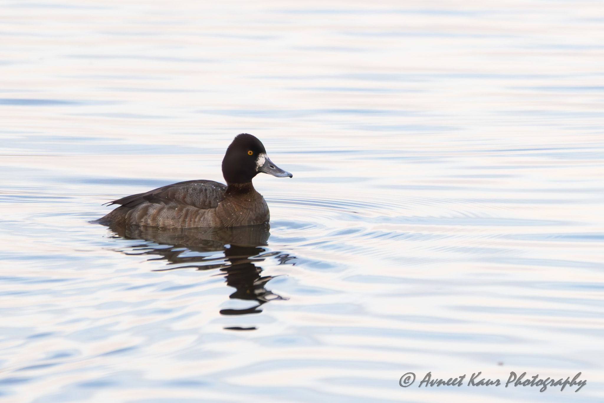 A lesser scaup – hen floats serenely on calm water, its reflection visible on the smooth surface. Soft light creates a tranquil, peaceful scene!!! Lexington – Kentucky; February 16, 2026