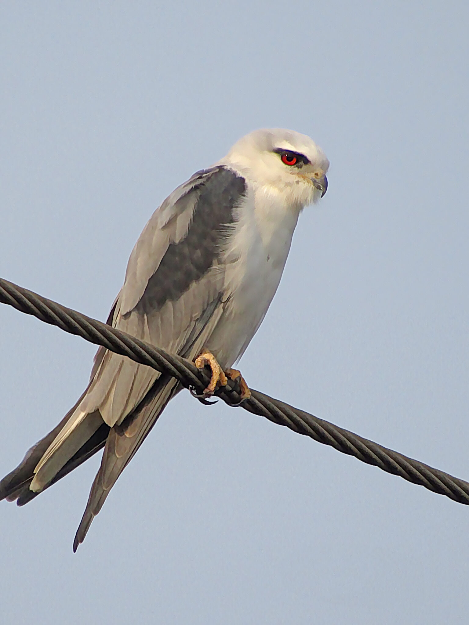 It is also Known as the black shouldered kite and has owl type behavior with large wing span. The male female difference is the male has dark red eyes female has yellow eyes. The clutch consists of 5 eggs incubation is done by female it takes 30 days chicks are born with white they fledge after 5 weeks. The eggs are creamy white with heavy red or chocolate brown spots. The breeding season is in febreuary march or after monsoon with twig nest lined with soft material in trees or palms.