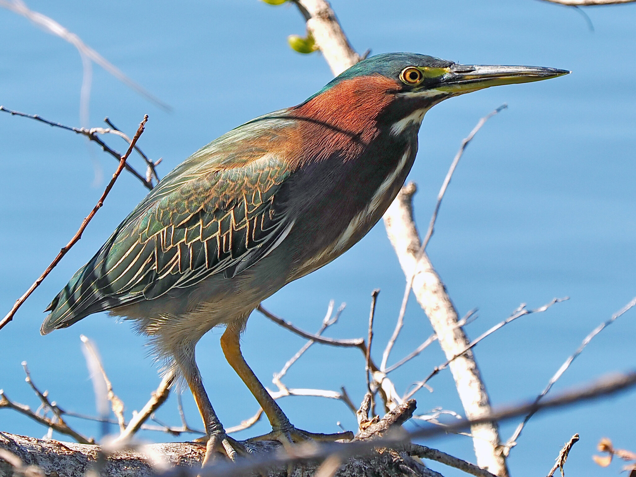 Most of the year, Green Herons are quiet and solitary. However, we observed 8-10 squawking and chasing each other through low bushes next to a salt marsh. To top it off, they were in beautiful breeding plumage – I don’t recall ever seeing Green Herons with such beautiful patterns and colors!