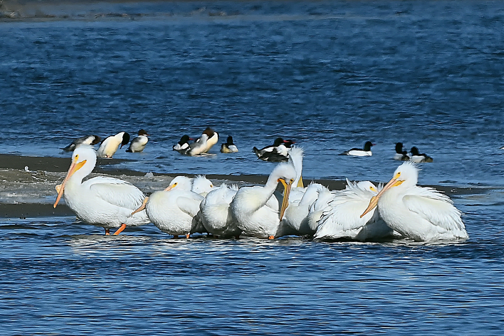 A pod of pelicans huddles up in the Mississippi River south of the I-280 bridge at Davenport. I believe the birds behind them are common mergansers.