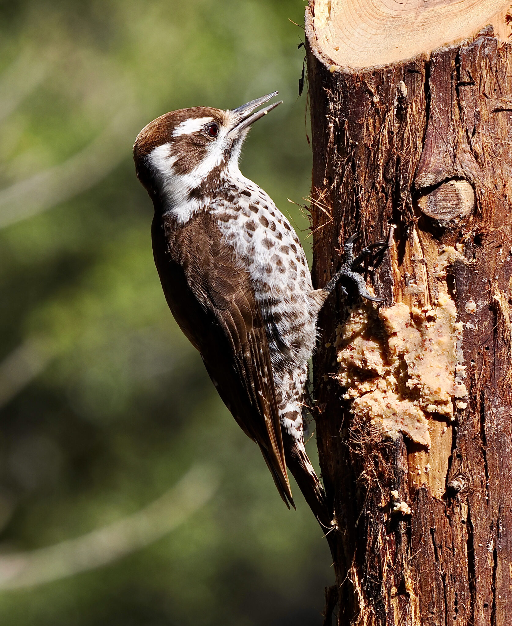 While in Arizona, we drove to Madera Canyon, which is about 30 miles south of Tucson, and went to the Santa Rita Lodge. The owner of the Lodge has maintained more than a dozen bird feeders for 20 years – to attract birdwatchers to his lodge. Such fun! I wanted especially to see the Acorn Woodpeckers but also saw this female Arizona Woodpecker.