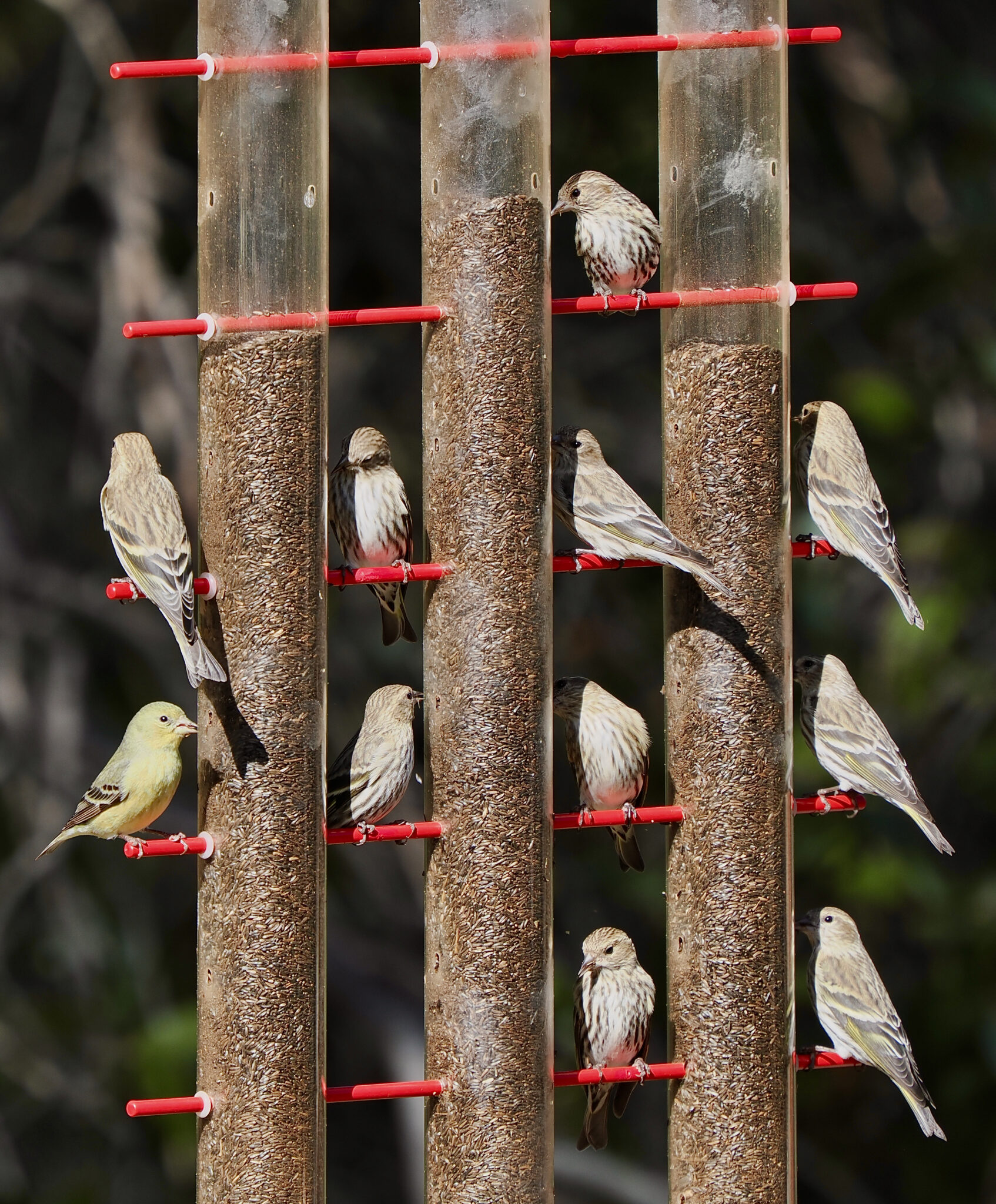 While in Arizona, we drove to Madera Canyon, which is about 30 miles south of Tucson, and went to the Santa Rita Lodge. The owner of the Lodge has maintained more than a dozen bird feeders for 20 years – to attract birdwatchers to his lodge. There was small flock of Pine Siskins at the feeders that were easily spooked. But when they were feeling secure, they appeared as a group! This three-column nyjer (thistle) feeder accommodated them perfectly! Hey – what’s that Lesser Goldfinch doing here?