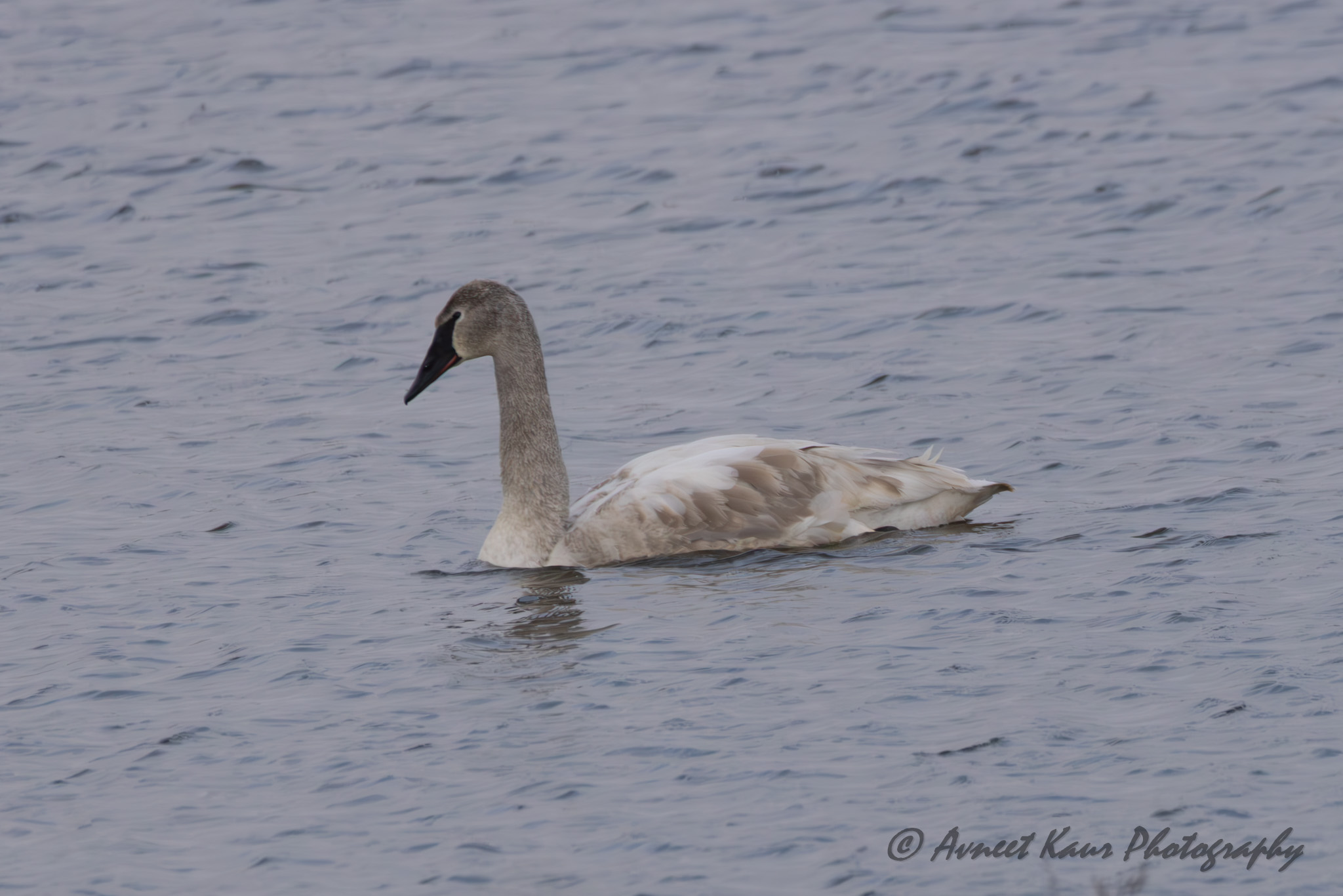 A trumpeter swan with an elegant posture floats on a calm lake. Its white and gray feathers reflect subtly in the rippling water!!! Local Pond – Lexington, Kentucky; February 22, 2026