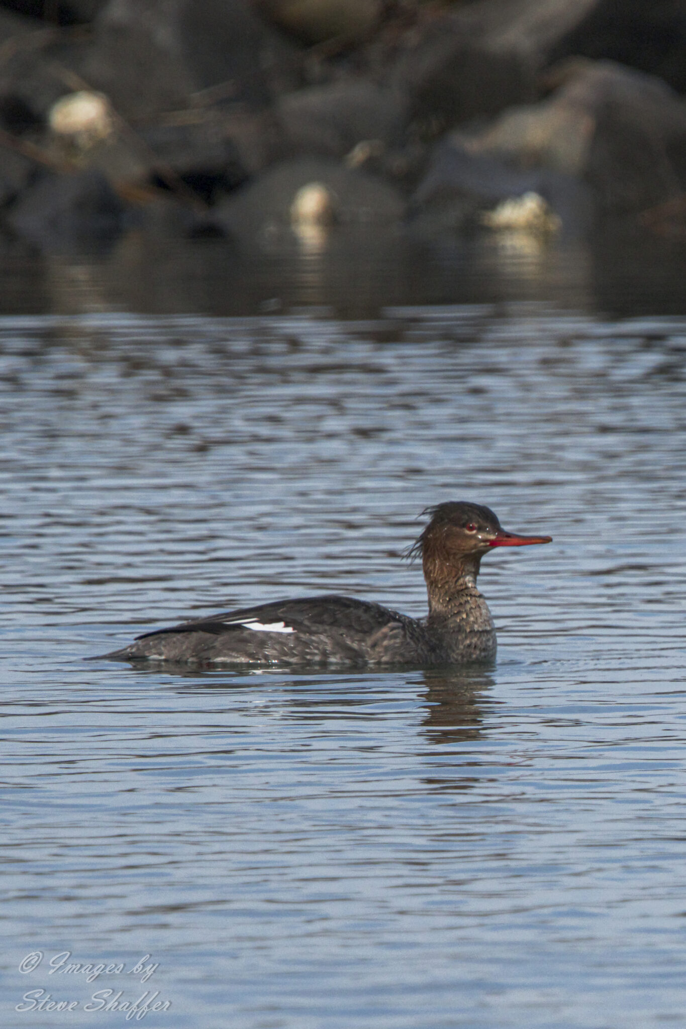 Image of female/immature male red-breasted merganser shot from causeway to Burton’s island in Rehoboth Bay