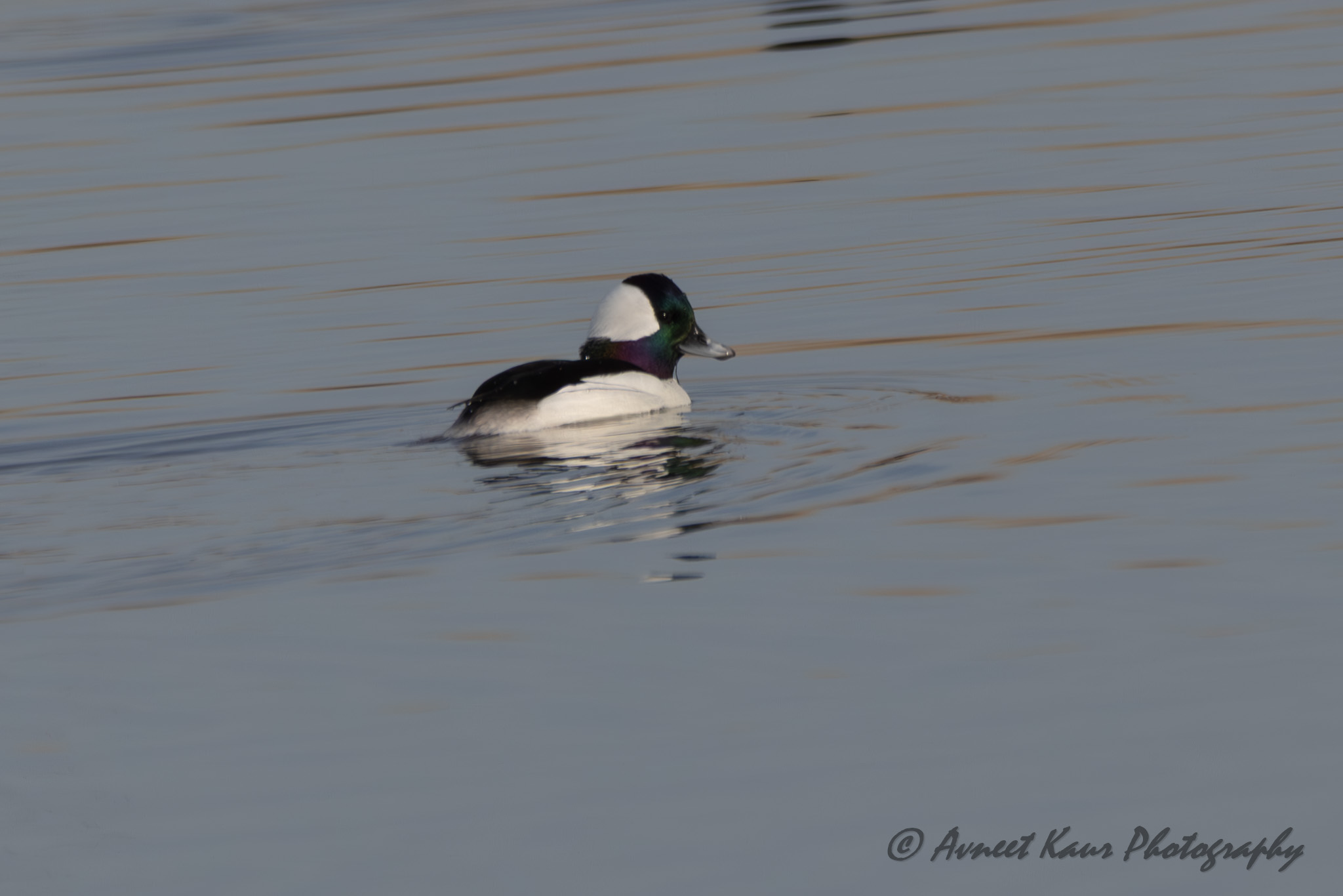 A bufflehead swims peacefully across a calm body of water, creating gentle ripples. The soft colors and serene setting highlight the duck’s natural grace!!! Hamilton, Ohio; February 28, 2026