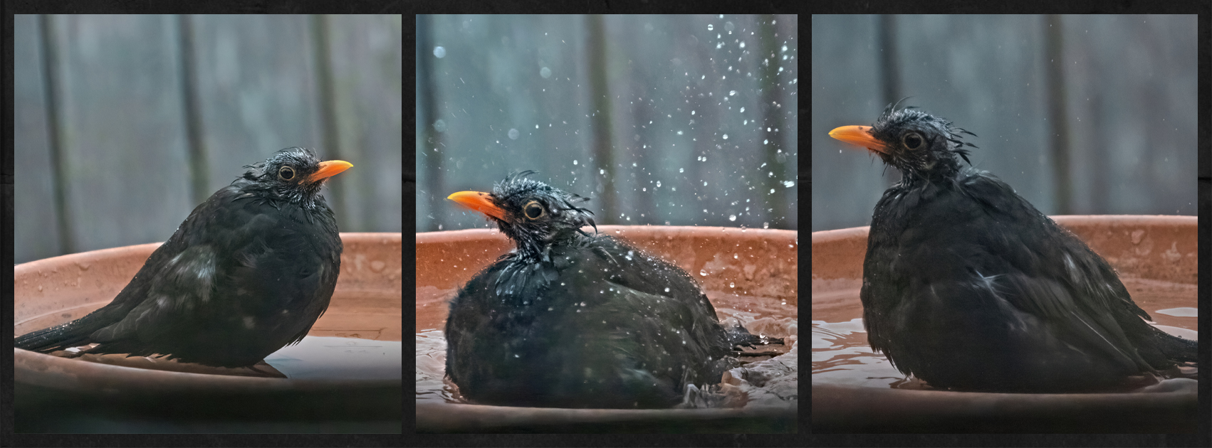 This Blackbird comes in most days to have a bath on our deck at home. ‘Thinking about a bath, having a bath and after thoughts’