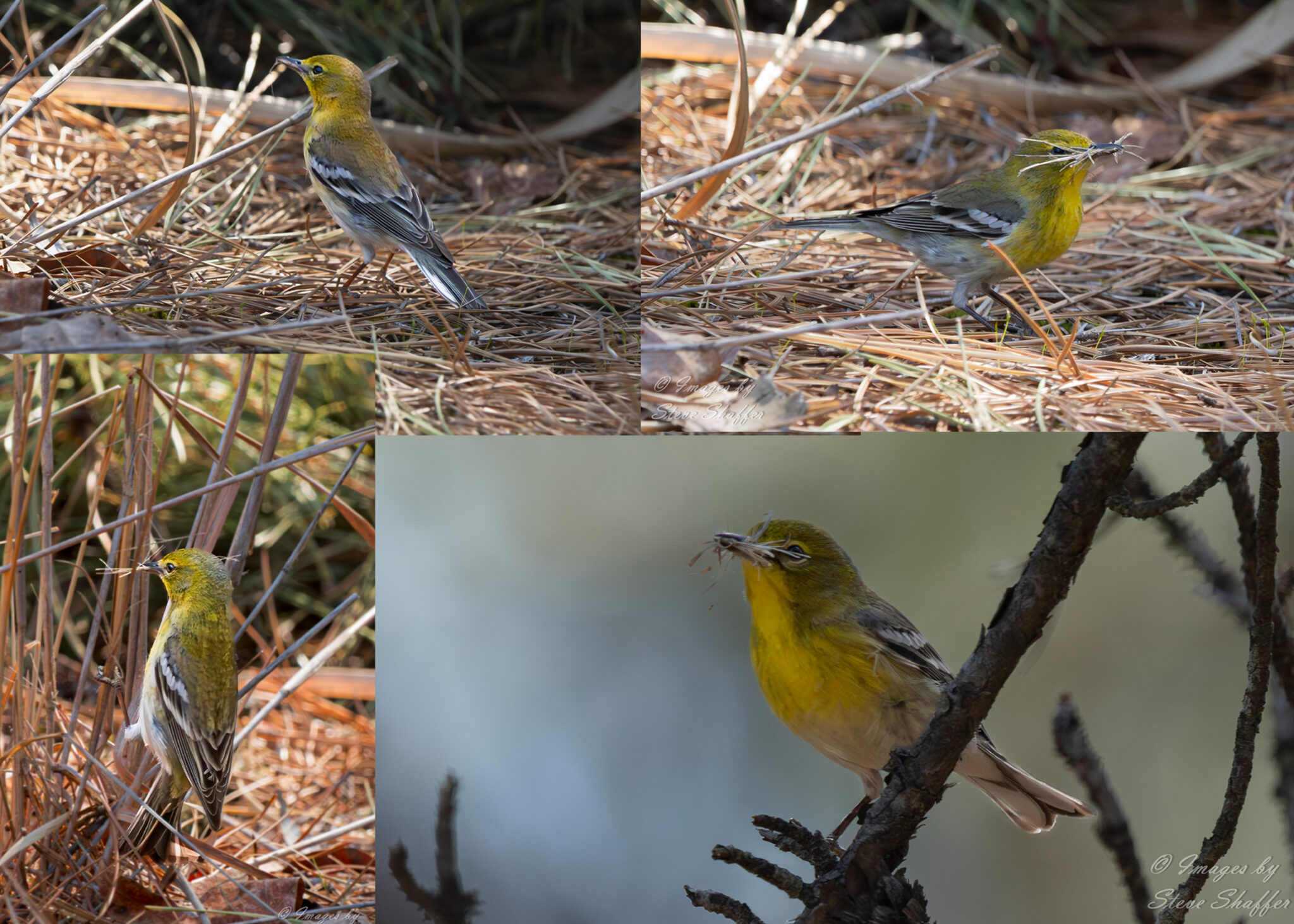 Series of images of a male pine warbler gathering nesting material in the pine dunes of Cape Henlopen State Park.