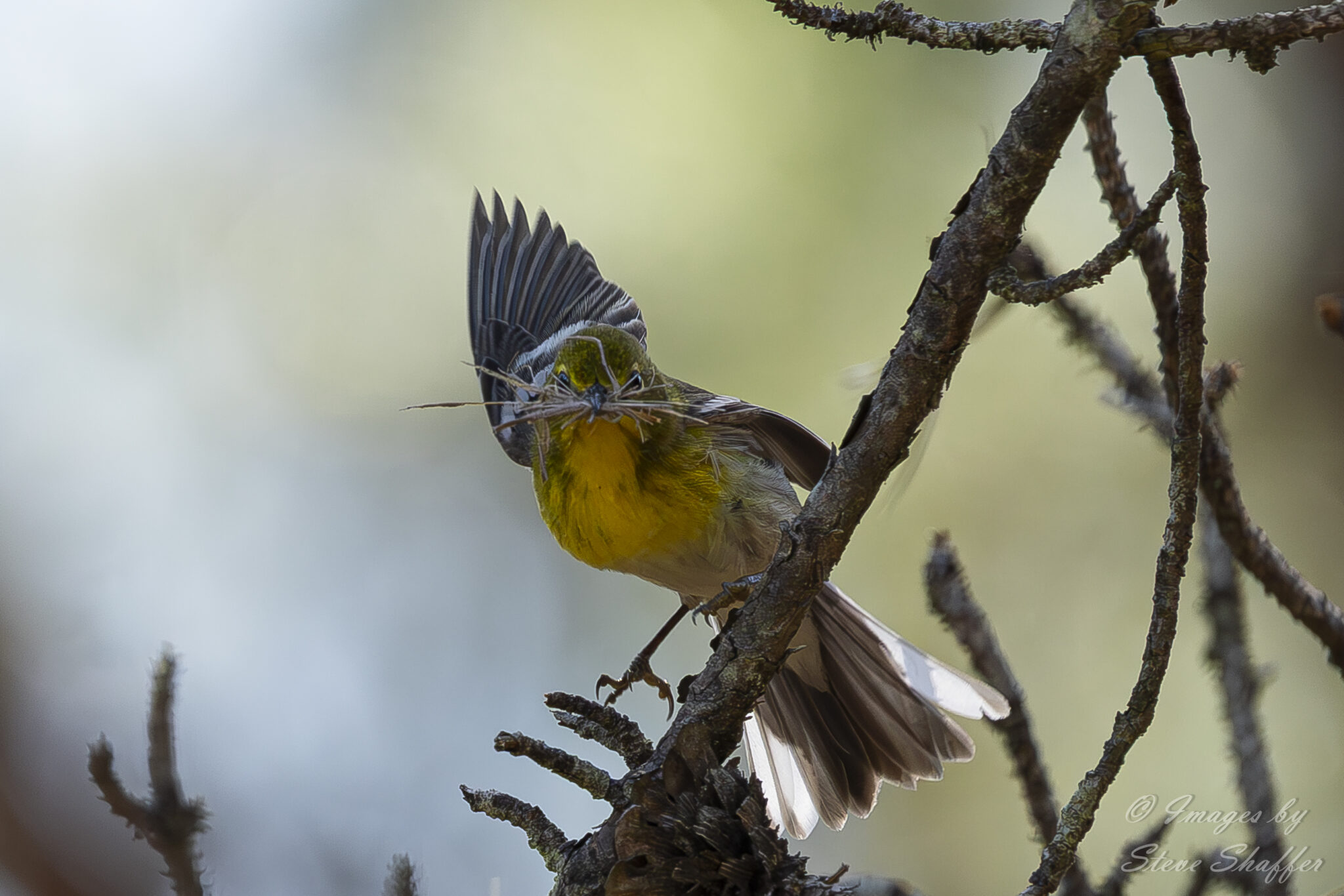 Image of a male pine warbler transporting nesting material in the pine dunes of Cape Henlopen State Park.