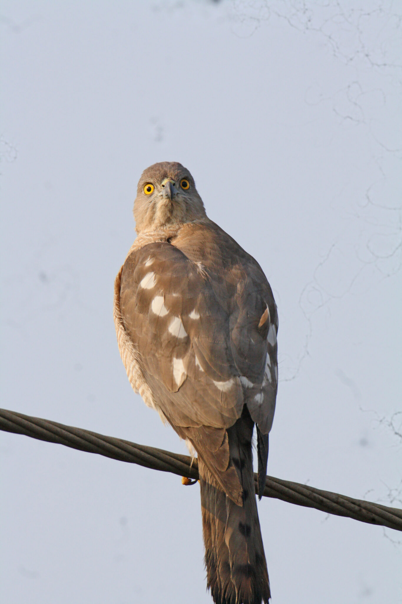 The Shikra is a small bird of prey with a long barred tail and powerful wings. The shikra has a light breast and marked with reddish barring males and females differ slightly in their colors. The male has deep red eyes while females have orange yellow eyes. Shikra is known to be a fierce hunter. It feeds on lizards frogs and large insects. Both male female built the nest. Clutch consists of four eggs incubation period is 3 weeks, The males are light blue on top females are dark brown.