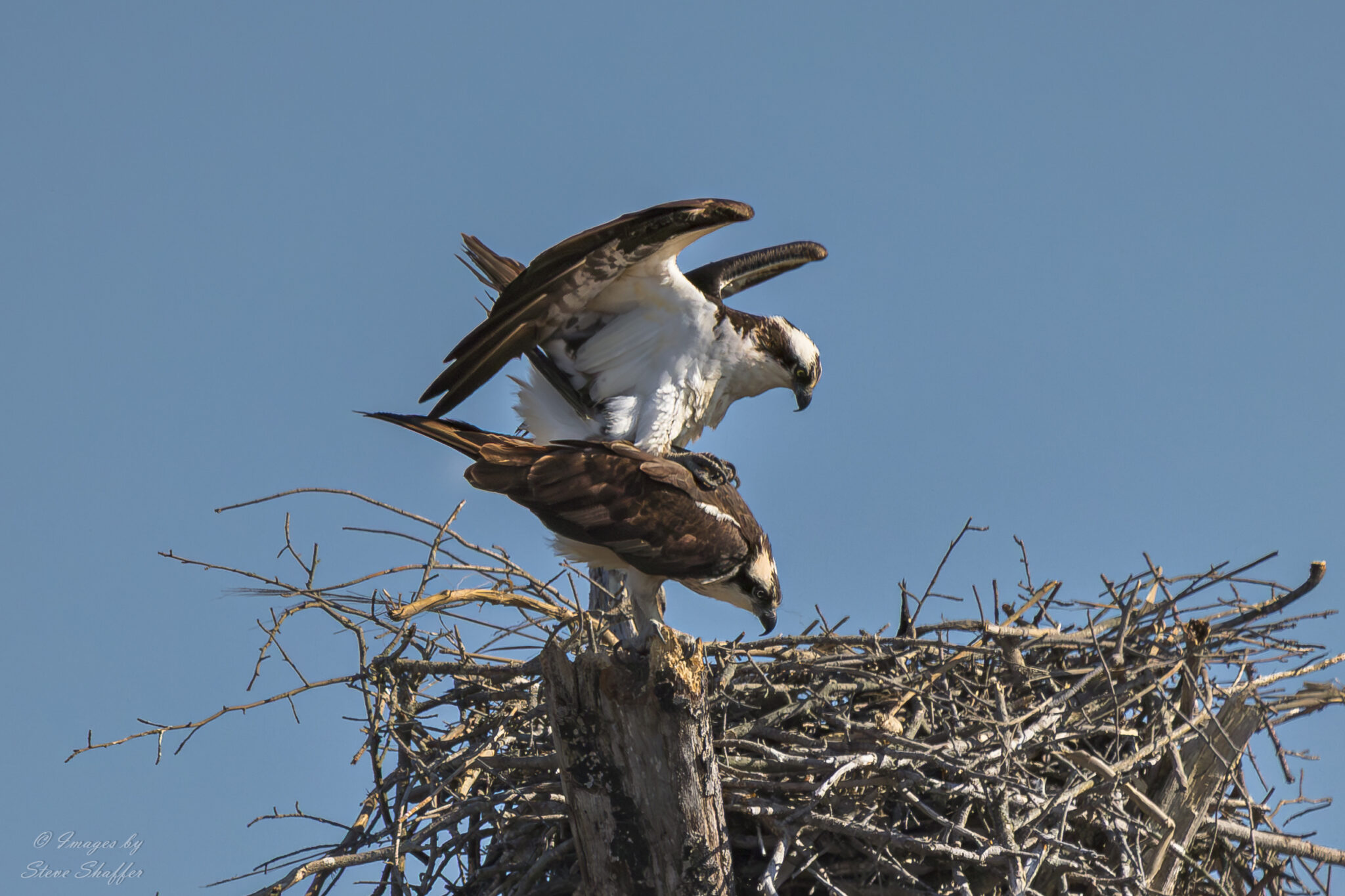 Have followed this osprey pair for the past 4 years and previously documented their nesting technique/behavior and today continued to document nest building intermixed with mating for the first time since I have followed them.