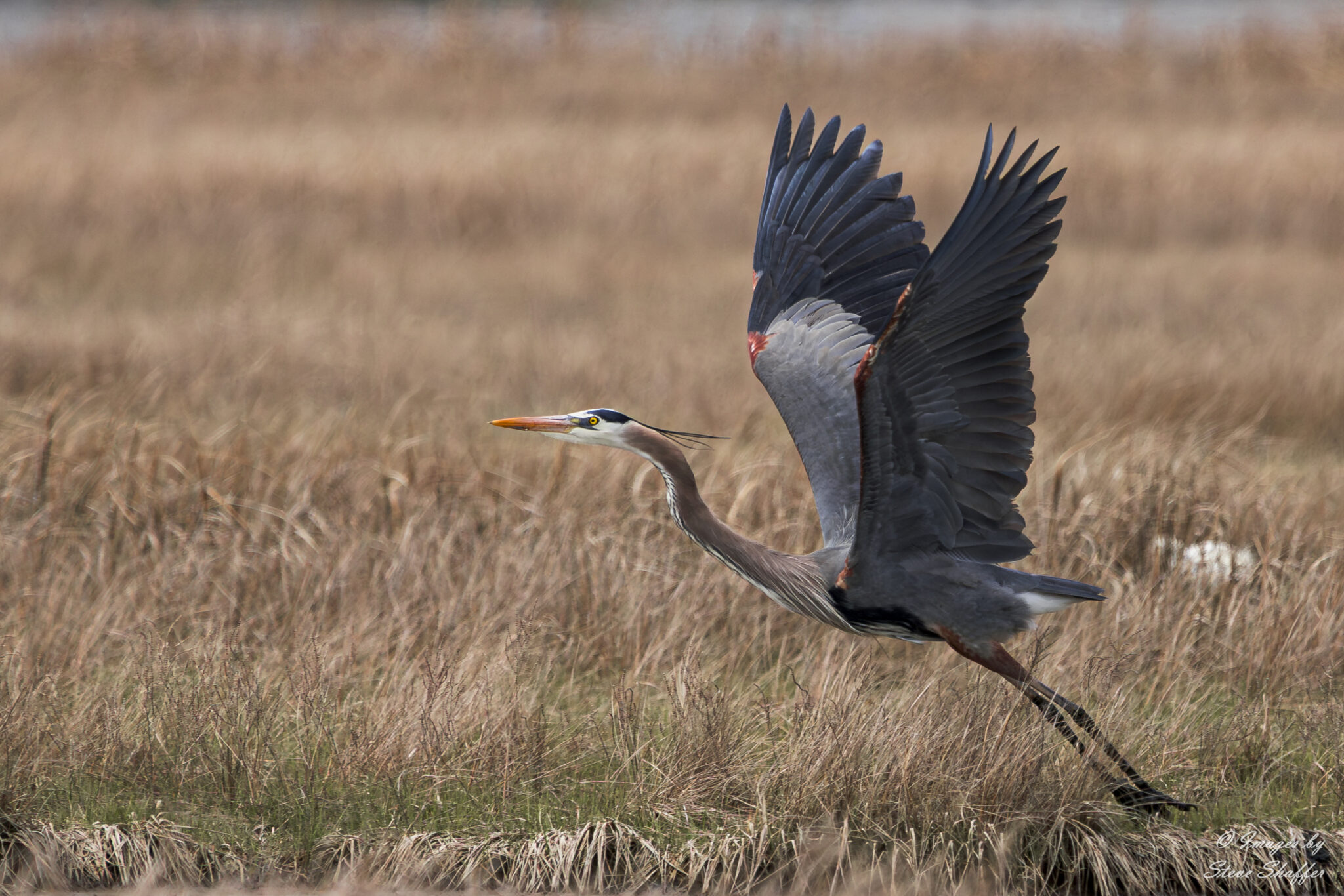 A great blue heron foraging in the marshlands at Oyster Rocks Preserve