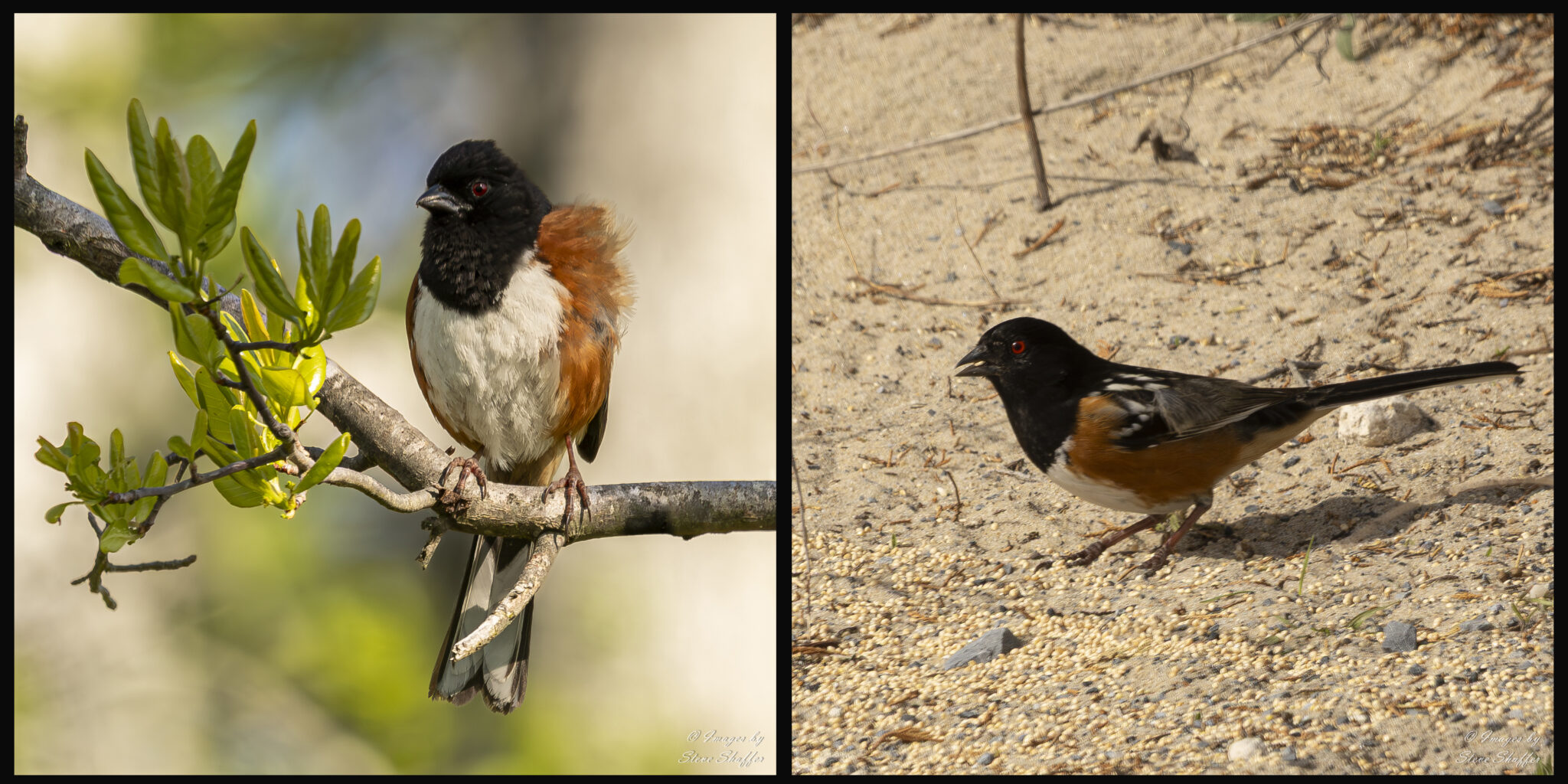 Finally got a shot of our native Eastern Towhee today (so elusive!) at Prime Hook NWR and wanted to compare it to a Spotted (Western) Towhee that had ventured into Cape Henlopen State Park last year about this time of year which was the first sighting of the species in DE that I had the privilege of capturing!