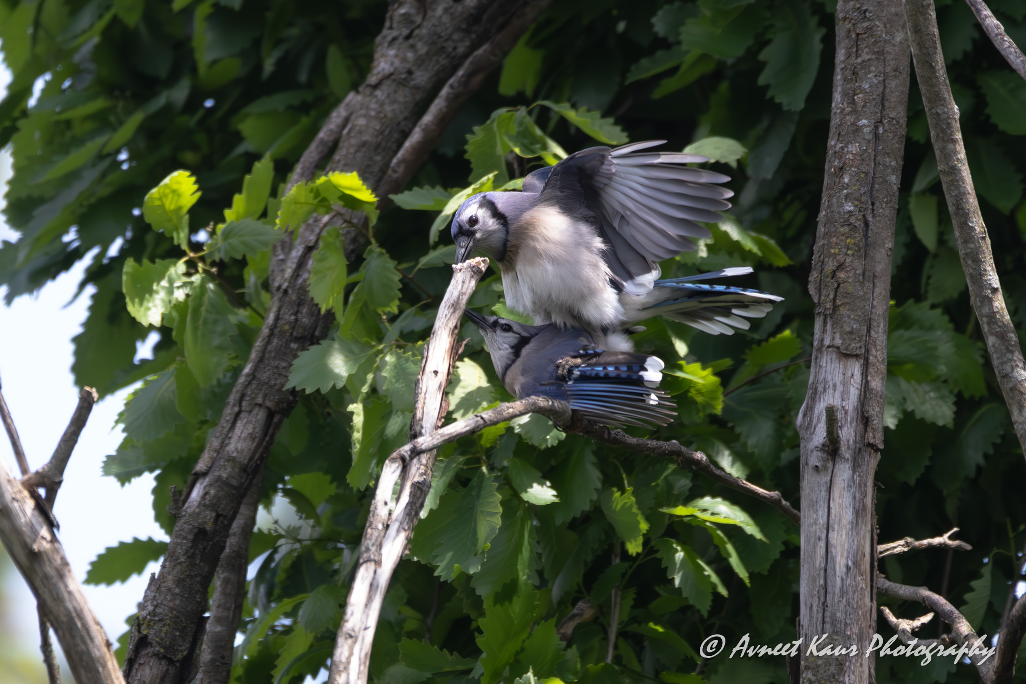 Two blue jays perch on a branch amidst lush green leaves. Their feathers are detailed, showcasing graceful wings mid-motion!!! Louisville – Kentucky; April 25, 2026