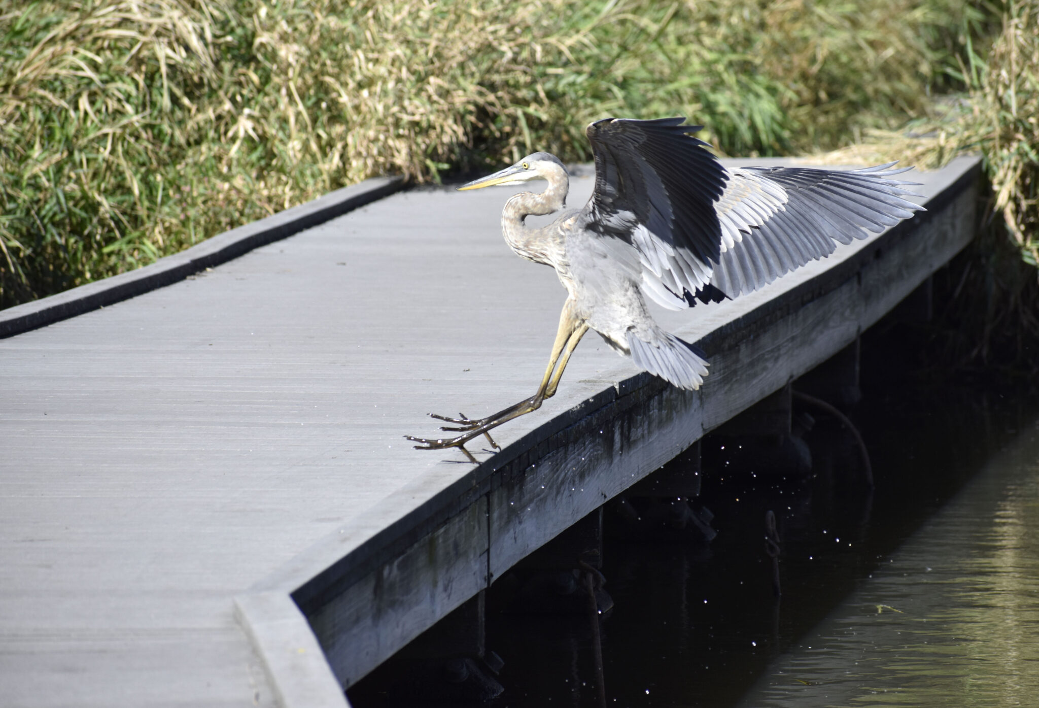 Great Blue Heron leaping from a pond and touching down on a bridge