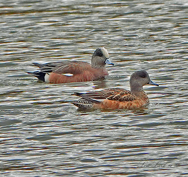 March is when we usually see migrant ducks coming to our backyard pond. Sometimes they stick around a few days, other times they are gone in a few hours. This pair of American Wigeons was new to the pond this year, and they didn’t stay long. The male has a brilliant green patch on the side of his head, which unfortunately didn’t show up in this photo on this dreary overcast day.